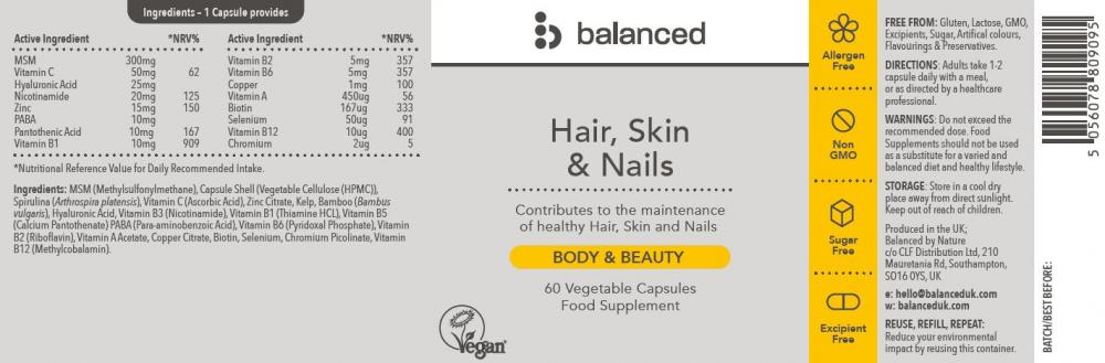 Ingredients: MSM, Capsule Shell (Vegetable Cellulose (HMPC)), Spirulina, Vitamin C (Ascorbic Acid), Zinc Citrate, Kelp, Bamboo (Bambusa vulgaris), Hyaluronic Acid, Vitamin B3 (Nicotinamide), Vitamin B1 (Thiamine HCL), Vitamin B5 (Calcium Pantothenate), PABA (Para-aminobenzoic Acid), Vitamin B6 (P5P), Vitamin B2 (Riboflavin), Vitamin A (Acetate), Copper Citrate, Biotin, Selenium, Chromium Picolinate, Vitamin B12 (Methylcobalamin)