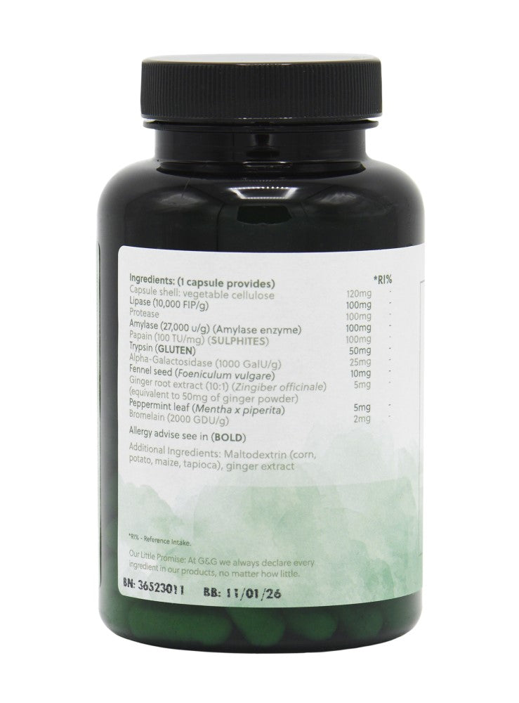 Ingredients: Lipase (maltodextrin (corn), lipase enzymes), Protease (maltodextrin, protease enzyme), Amylase (maltodextrin (potato), amylase enzyme), Papain (SULPHITES) maltodextrin, papain enzyme, Bromelain (di calcium phosphate, bromelain, maltodextrin (corn)) Trypsin ((GLUTEN) (DAIRY) (SOY)) (maltodextrin (corn), trypsin enzyme), Alpha-Galactosidase (alpha-galactosidase, maltodextrin (corn)), Fennel seed, Ginger root ext (10:1), (ginger extract, maltodextrin), (equivalent of ginger powder), Peppermint leaf.