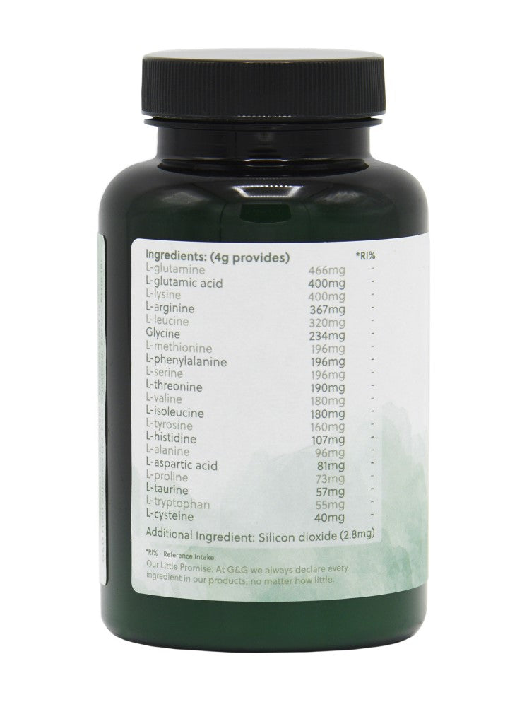Ingredients: L-glutamic acid, L-lysine, L-glutamine, L-arginine, L-leucine, L-isoleucine, L-valine, Glycine, L-methionine, L-phenylalanine, L-serine, L-threonine, L-tyrosine, L-histidine, L-alanine, L-aspartic acid, L-proline, L-taurine, L-tryptophan, L-cysteine.