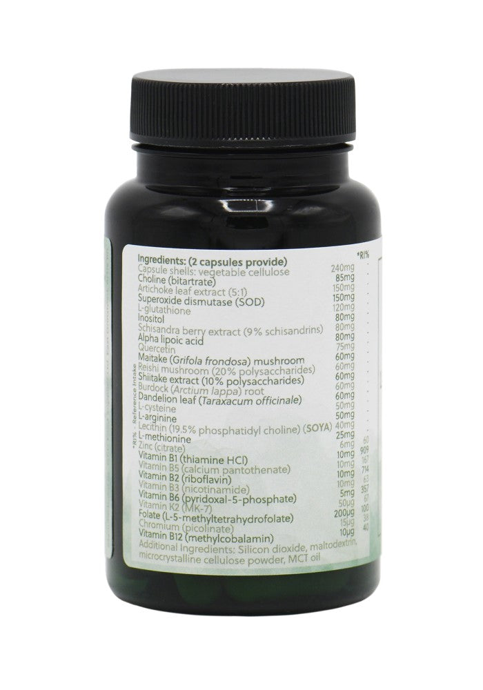Ingredients: Artichoke leaf extract (5:1), Superoxide dismutase (SOD), L-glutathione, Choline (bitartrate), Alpha lipoic acid, Schisandra berry extract (9% schisandrins), Inositol, Quercetin, Maitake (Grifola frondosa) mushroom, Reishi mushroom (20% polysaccharides), Shitake extract (10% polysaccharides), Burdock (Arctium lappa) root, Dandelion (Taraxacum officinale) leaf, L-arginine, L-cysteine, Lecithin (19.5% phosphatidyl choline), L-methionine, Vitamin B1 (thiamine HCl), Vitamin B2 (riboflavin), Vitamin B3 (nicotinamide), Vitamin B5 (calcium pantothenate), Zinc (citrate), Vitamin B6 (pyridoxal-5-phosphate), Folic acid (L-5-methyltetrahydrofolate), Vitamin K2 (MK-7), Chromium (picolinate), Vitamin B12 (methylcobalamin), vegetable cellulose capsule.
