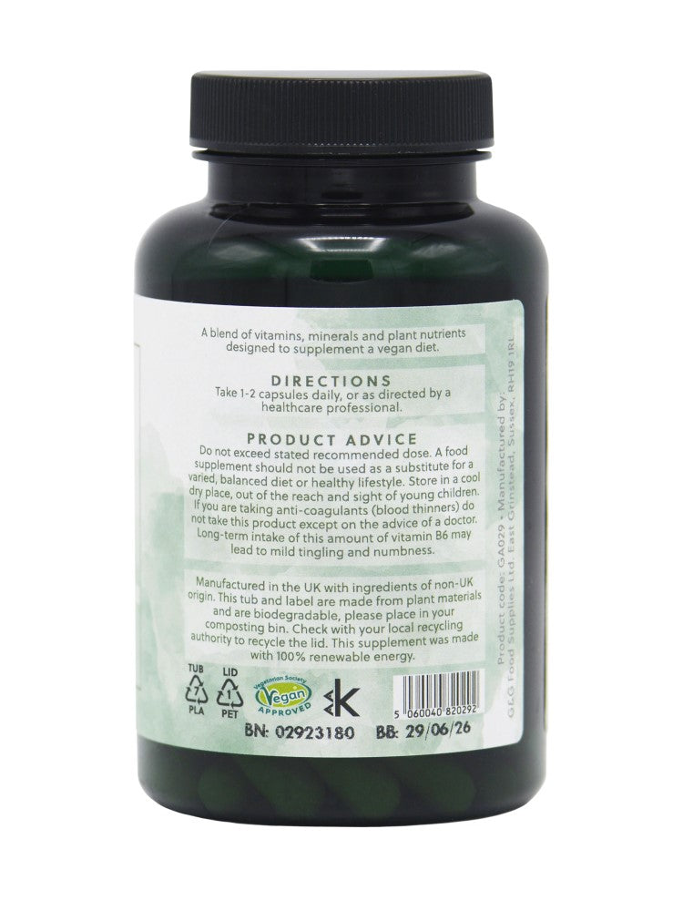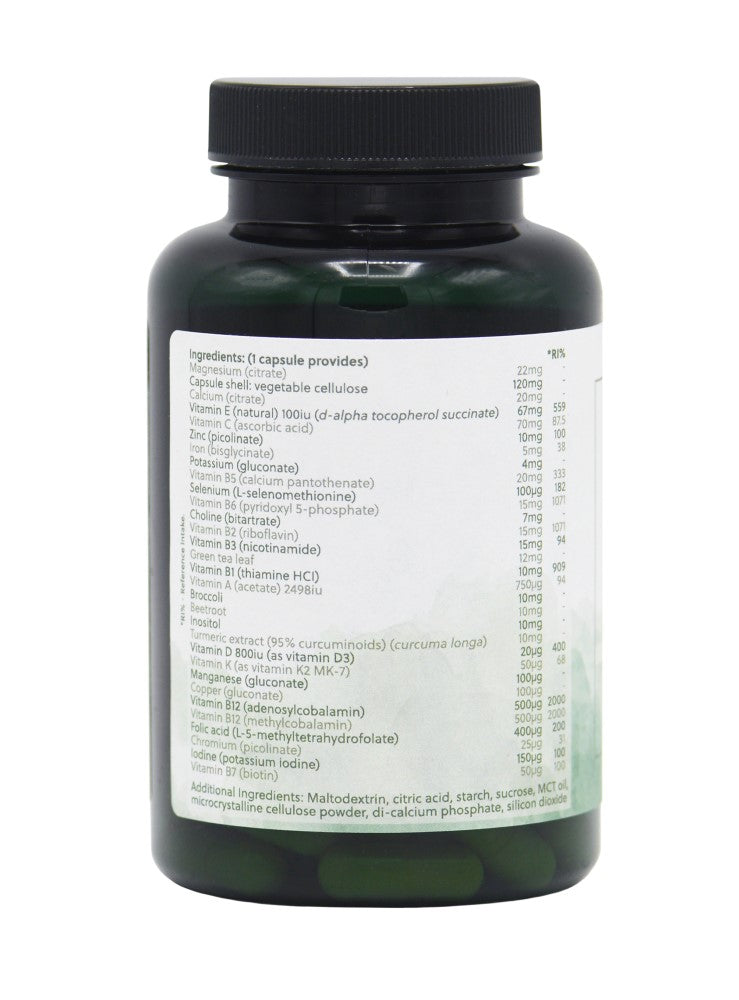 Ingredients: Magnesium (citrate), calcium (citrate), vitamin E (d-alpha tocopherol succinate), vitamin C (ascorbic acid), zinc (picolinate), iron (bisglycinate), potassium (gluconate), vitamin B5 (calcium pantothenate), selenium (l-selenomethionine), vitamin B6 (P5P) (pyridoxyl 5-phosphate), choline (bitartrate), vitamin B2 (riboflavin), vitamin B3 (nicotinamide), green tea leaf, vitamin B1 (thiamine HCl), vitamin A (acetate), broccoli, beetroot, inositol, turmeric extract (curcuma longa), vitamin D3, vitamin K2 (MK-7), manganese (gluconate), copper (gluconate), vitamin B12 (adenosylcobalamin), vitamin B12 (methylcobalamin), folic acid (L-5-methyltetrahydrofolate), chromium (picolinate), iodine (potassium iodide), biotin, maltodextrin, citric acid, starch, sucrose, MCT oil, microcrystalline cellulose powder, di-calcium phosphate, silicon dioxide, capsule shell: vegetable cellulose