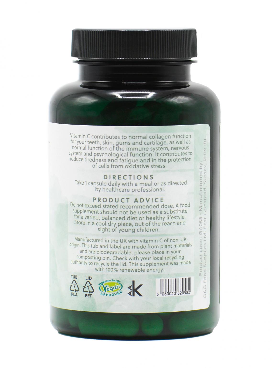 G&G use a blend of pure vitamin C powder (ascorbic acid), acerola cherries and rose hip, which can assist the absorption of vitamin C, as well as magnesium and calcium. This vitamin C supplement is suitable for vegetarians and vegans. It is also approved kosher and does not contain any allergens.
