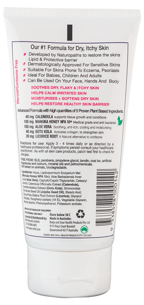 Ingredients: Aqua, Leptospermum Scoparium Mel (Manuka Honey), Aloe Barbadensis (Aloe Vera), Capric Triglyceride, Cetearyl alcohol, Calendula Officinalis Extract (Calendula), Centella Asiatica Extract (Gotu Kola), Simmondsia Chinensis Seed Oil (Jojoba seed oil), Stearic Acid, Glycyrrhiza Glabra (Licorice), Glyceryl Stearate, Tocopheryl Acetate (Vit E), Vegetable Glycerin, Benzyl alcohol, Phenoxyethanol, Potassium Sorbate.