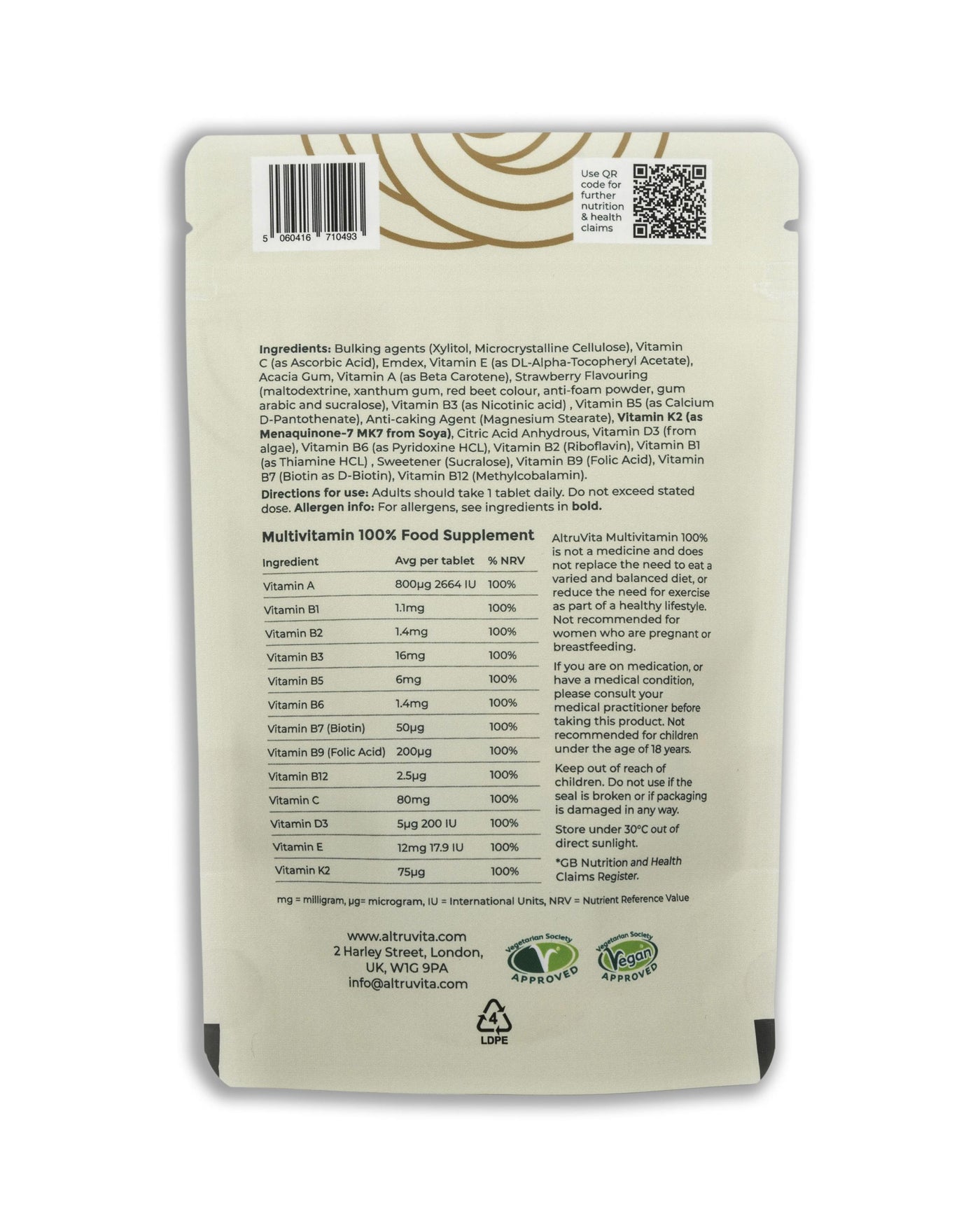Ingredients: Bulking agents (Xylitol, Microcrystalline Cellulose), Vitamin C (as Ascorbic Acid), Emdex, Vitamin E (as DL-Alpha-Tocopheryl Acetate), Acacia Gum, Vitamin A (as Beta Carotene), Natural Strawberry Flavouring (maltodextrine, xanthum gum, red beet colour, anti-foam powder, gum arabic and sucralose), Vitamin B3 (as Nicotinic acid) , Vitamin B5 (as Calcium D-Pantothenate), Anti-caking Agent (Magnesium Stearate), Vitamin K2 (as Menaquinone-7 MK7 from Soya), Citric Acid Anhydrous, Vitamin D3 (from algae), Vitamin B6 (as Pyridoxine HCL), Vitamin B2 (Riboflavin), Vitamin B1 (as Thiamine HCL) , Sweetener (Sucralose), Vitamin B9 (Folic Acid), Vitamin B7 (Biotin as D-Biotin), Vitamin B12 (Methylcobalamin).