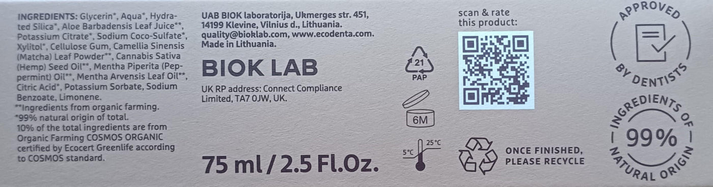 Ingredients: Glycerin*, Aqua*, Hydrated Silica*, Aloe Barbadensis Leaf Juice**, Tripotassium Citrate*, Sodium Coco-Sulfate*, Xylitol*, Cellulose Gum, Camellia Sinensis (Matcha) Leaf Powder**, Cannabis Sativa (Hemp) Seed Oil**, Mentha Piperita (Peppermint) Oil**, Mentha Arvensis Leaf Oil**, Citric Acid*, Potassium Sorbate, Sodium Benzoate