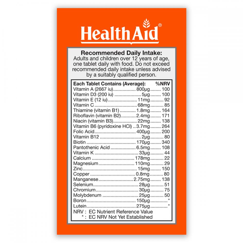 Ingredients: Bulking Agent (tricalcium phosphate, microcrystalline cellulose, hydroxypropyl cellulose), Magnesium Oxide, Potassium Chloride, Vitamin C (ascorbic acid), Coating (HPMC, talc, calcium carbonate, black & yellow iron oxides), Anti-caking Agent (veg. stearic acid, silicon dioxide, veg. magnesium stearate), Vitamin E Acetate (dl-alpha tocopherol), Nicotinamide, Zinc Oxide, Vitamin A Acetate, Manganese Sulphate, Calcium-D-Pantothenate, Pyridoxine Hydrochloride, Copper Sulphate, Riboflavin, Thiamine Mononitrate, Vitamin D3 (cholecalciferol), Lutein, Disodium Tetraborate, Vitamin K1, Folic Acid, Biotin, Chromium Chloride, Sodium Selenite, Sodium Molybdate, Cyanocobalamin (B12)