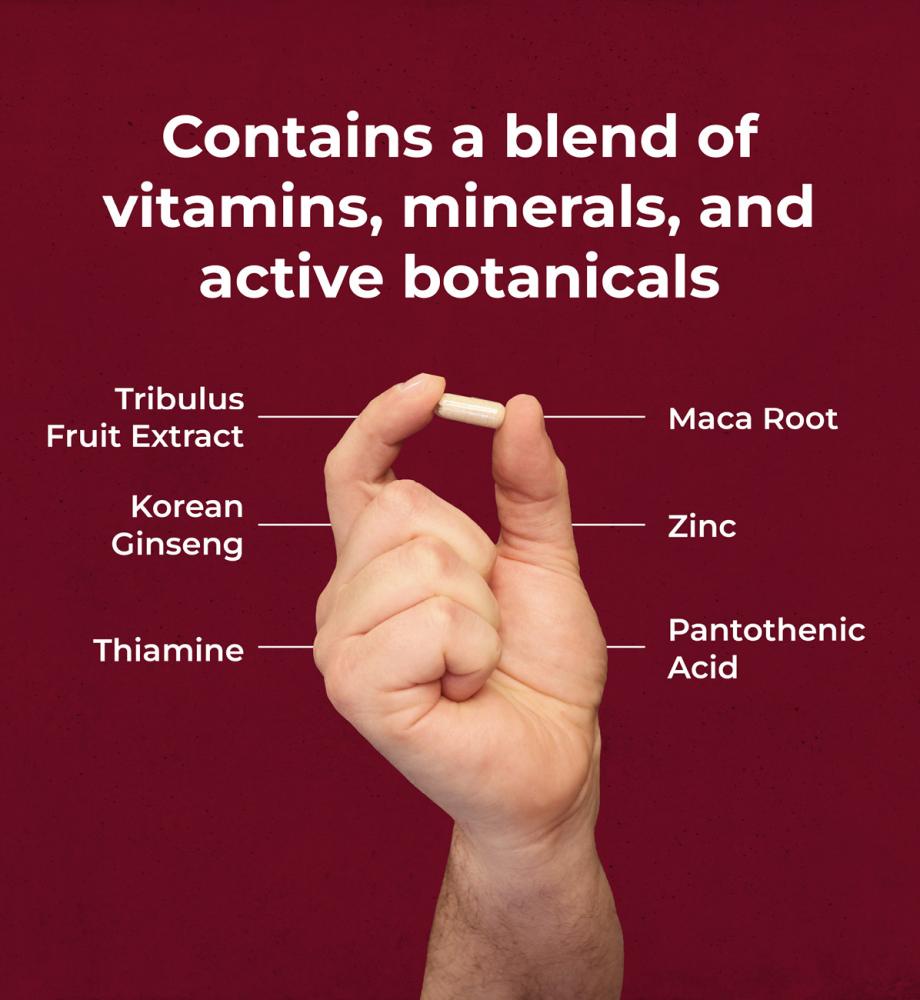 Ingredients: Tribulus Terrestris Fruit Extract (Tribulus terrestris), L-Arginine Hydrochloride, L-Citrulline, Maca Root Extract (Lepidium meyenii), Vegetable Capsule Shell (Hydroxypropyl Methylcellulose), Korean Ginseng Root Extract (Panax ginseng), L-Carnitine L-Tartrate, Zinc Citrate, Antioxidant (Fatty Acids of Ascorbic Acid), Calcium Pantothenate, Thiamine Hydrochloride, L-Selenomethionine