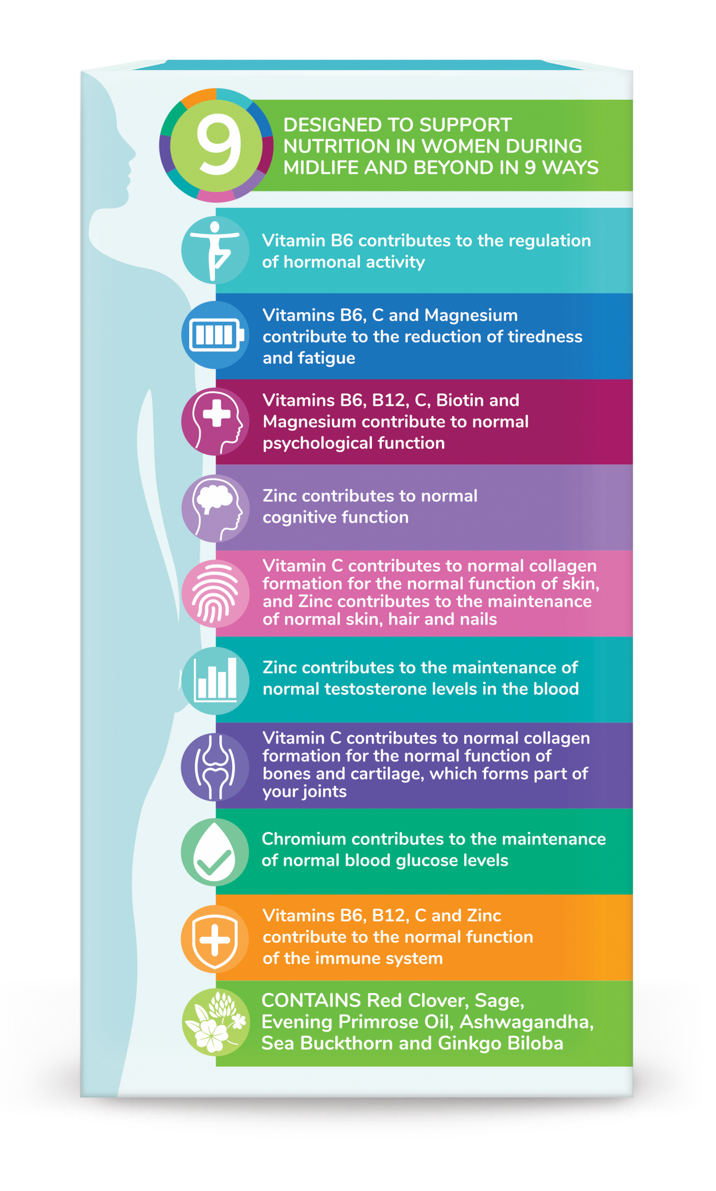 Ingredients: Magnesium Citrate, Vegetable Capsule Shell (Hydroxypropyl Methylcellulose), L-Arginine Hydrochloride, Ascorbic Acid (Vitamin C), Flaxseed Powder (Linum usititassiumum), Evening Primrose Seed Oil (Oenothera biennsis), Zinc Citrate, Sea Buckthorn Fruit Powder (Hippophae rhamnoides), Siberian Ginseng Root Extract (Eleutherococcus senticosus), Ashwagandha Root Extract (Withania somnifera), Calcium Pantothenate, Sage Leaf Extract (Salvia officinalis), Anticaking Agent (Ascorbyl Palmitate), Red Clover Aerial Parts Extract (Trifolium pratense), Brown Rice Flour, Pyridoxine Hydrochloride (Vitamin B6), Cranberry Fruit Extract (Vaccinium macrocarpon), Riboflavin (Vitamin B2), Gingko Biloba Leaf Extract (Ginkgo biloba), Retinyl Palmitate (Vitamin A), Methylcobalamin (Vitamin B12), Chromium Picolinate, Biotin
