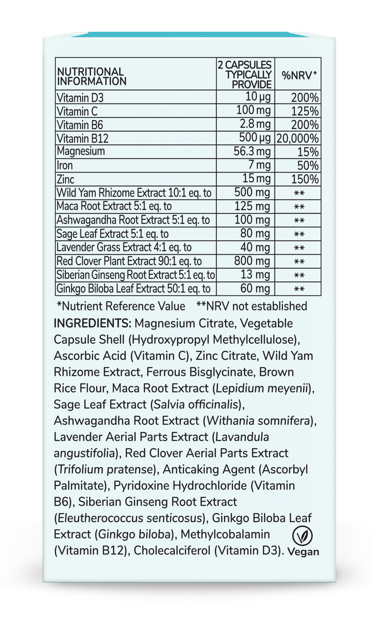 Ingredients: Magnesium Citrate, Vegetable Capsule Shell (Hydroxypropyl Methylcellulose), Ascorbic Acid (Vitamin C), Zinc Citrate, Wild Yam Rhizome Extract, Ferrous Bisglycinate, Brown Rice Flour, Maca Root Extract (Lepidium meyenii), Sage Leaf Extract (Salvia officinalis), Ashwagandha Root Extract (Withania somnifera), Lavender Aerial Parts Extract (Lavandula angustifolia), Red Clover Aerial Parts Extract (Trifolium pratense), Anticaking Agent (Ascorbyl Palmitate), Pyridoxine Hydrochloride (Vitamin B6), Siberian Ginseng Root Extract (Eleutherococcus senticosus), Gingko Biloba Leaf Extract (Ginkgo biloba), Methylcobalamin (Vitamin B12), Cholecalciferol (Vitamin D3)