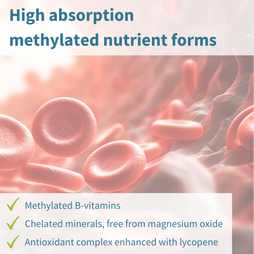 Ingredients: Bulking agents: microcrystalline cellulose, dicalcium phosphate, hydroxypropyl methylcellulose; vitamin C (ascorbic acid, ascorbyl palmitate); lycopene; zinc bisglycinate; nicotinamide; natural D-alpha-tocopherol; beta-carotene; calcium-D-pantothenate; menaquinone MK-7; cholecalciferol; pyridoxal-5-phosphate; boric acid; thiamin hydrochloride; riboflavin-5-phosphate sodium; copper bisglycinate; vitamin K1; L-[6S]-5-methyltetrahydrofolate; chromium picolinate; sodium selenite; potassium iodide; sodium molybdate; D-biotin; methylcobalamin