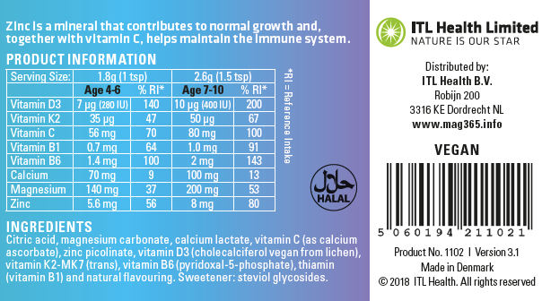 Ingredients: Ionic Magnesium citrate (created from citric acid and magnesium carbonate), calcium lactate, vitamin C (as calcium ascorbate), zinc picolinate, vitamin D3 (cholecalciferol vegan from lichen), vitamin K2-MK7 (trans), vitamin B6 (as pyridoxal-5-phosphate), thiamin (vitamin B1), natural flavouring, steviol glycosides