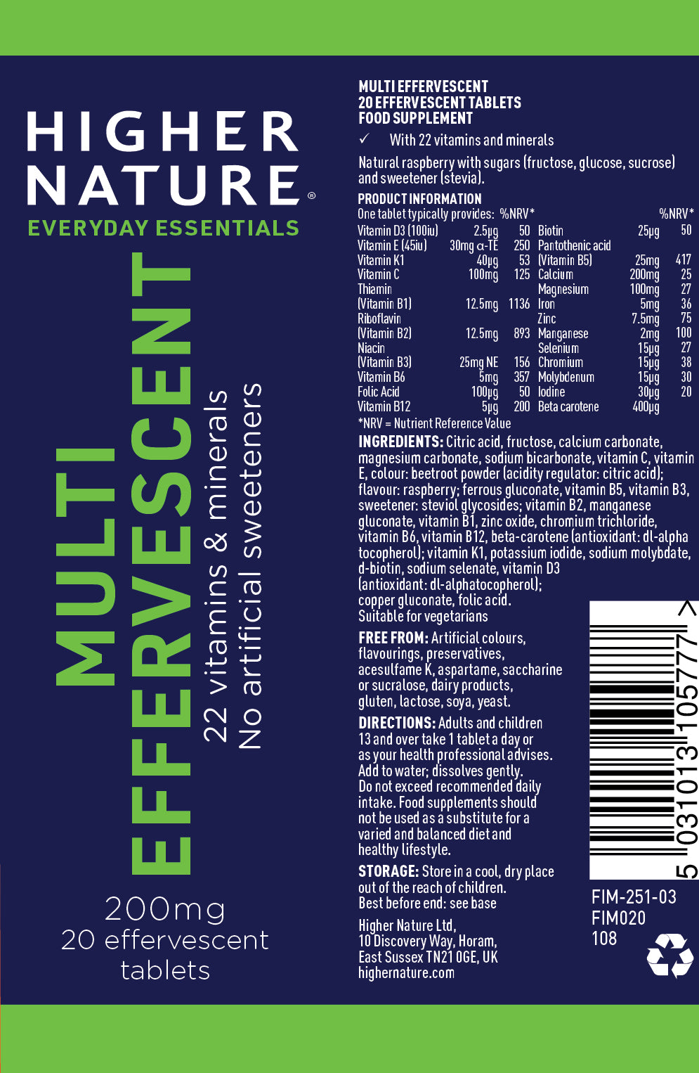 Ingredients: Citric acid, fructose, calcium carbonate, magnesium carbonate, sodium bicarbonate, vitamin C, vitamin E, colour: beetroot powder (acidity regulator: citric acid), flavour: raspberry, ferrous gluconate, vitamin B5, vitamin B3, sweetener: steviol glycosides, vitamin B2, manganese gluconate, vitamin B1, zinc oxide, chromium trichloride, vitamin B6, vitamin B12, beta carotene (antioxidant: dl-alpha tocopherol), vitamin K1, potassium iodide, sodium molybdate, d-biotin, sodium selenate, vitamin D3 (antioxidant: dl-alpha tocopherol), copper gluconate, folic acid