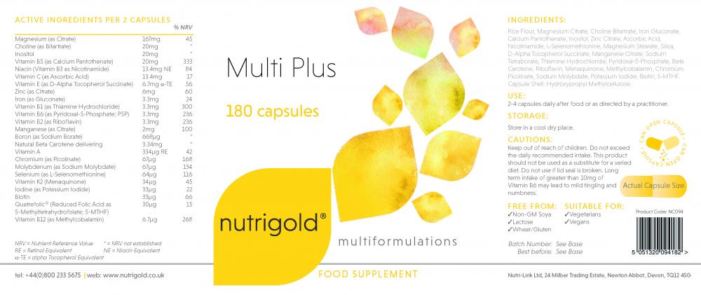 Ingredients: Rice Flour, Magnesium Citrate, Choline Bitartrate, Iron Gluconate, Calcium Pantothenate, Inositol, Zinc Citrate, Ascorbic Acid, Nicotinamide, L-Selenomethionine, Magnesium Stearate, Silica, D-Alpha Tocopherol Succinate, Manganese Citrate, Sodium Tetraborate, Thiamine Hydrochloride, Pyridoxal-5-Phosphate, Beta Carotene, Riboflavin, Menaquinone, Methylcobalamin, Chromium Picolinate, Sodium Molybdate, Potassium Iodide, Biotin, 5-MTHF, capsule shell: Hydroxypropyl Methylcellulose