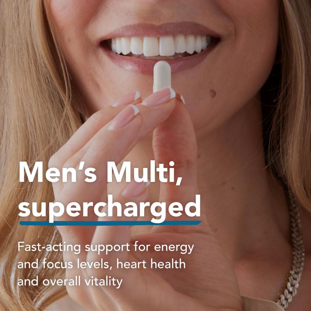 Liposomal mens multivitamin capsules, a blend of nutrients designed to optimise men's health, including energy, libido, focus, heart health and so much more.
