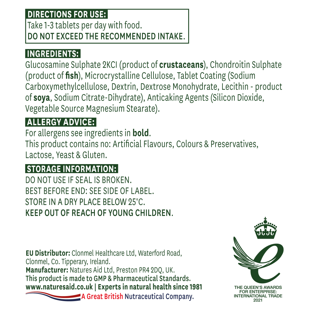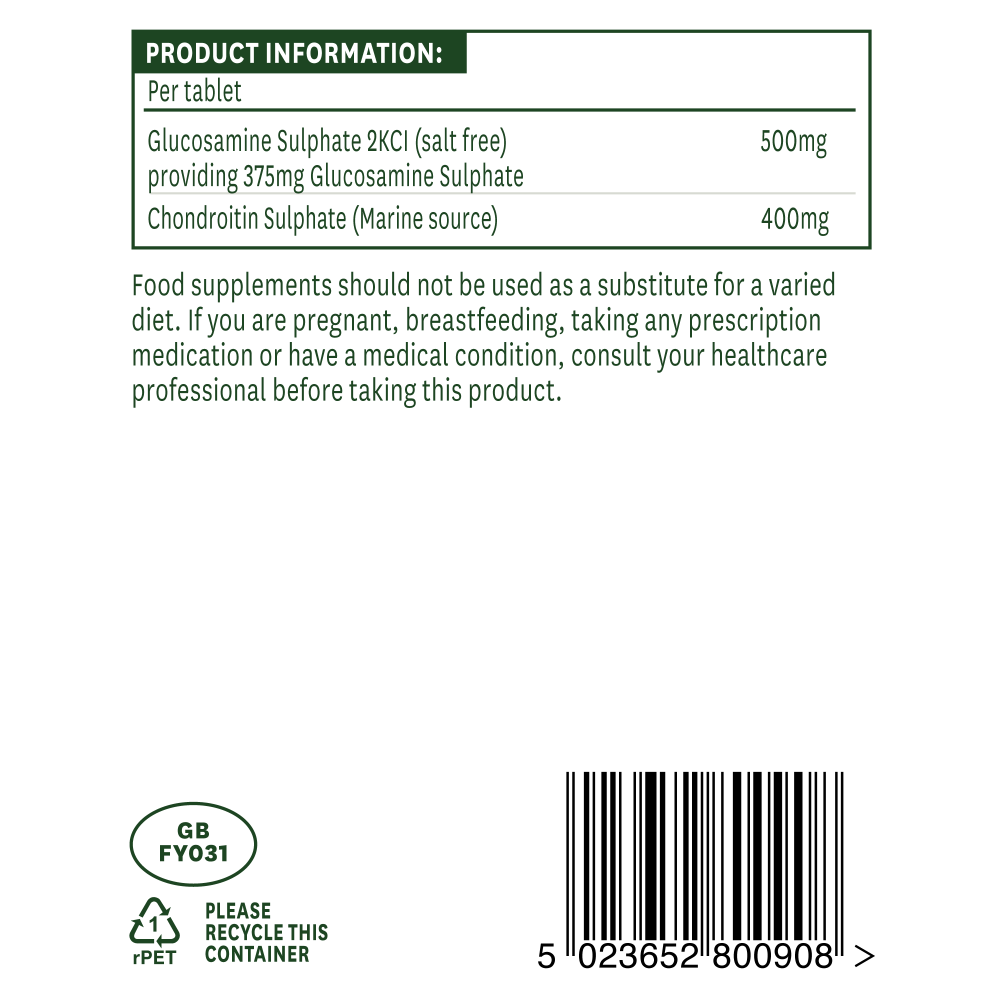 Ingredients: Glucosamine Sulphate 2KCI (product of crustaceans), Chondroitin Sulphate (product of fish), Microcrystalline Cellulose, Tablet Coating (Sodium Carboxymethylcellulose, Dextrin, Dextrose Monohydrate, Lecithin - product of soya, Sodium Citrate-Dihydrate), Anti-Caking Agents (Silicon Dioxide, Vegetable Source Magnesium Stearate).