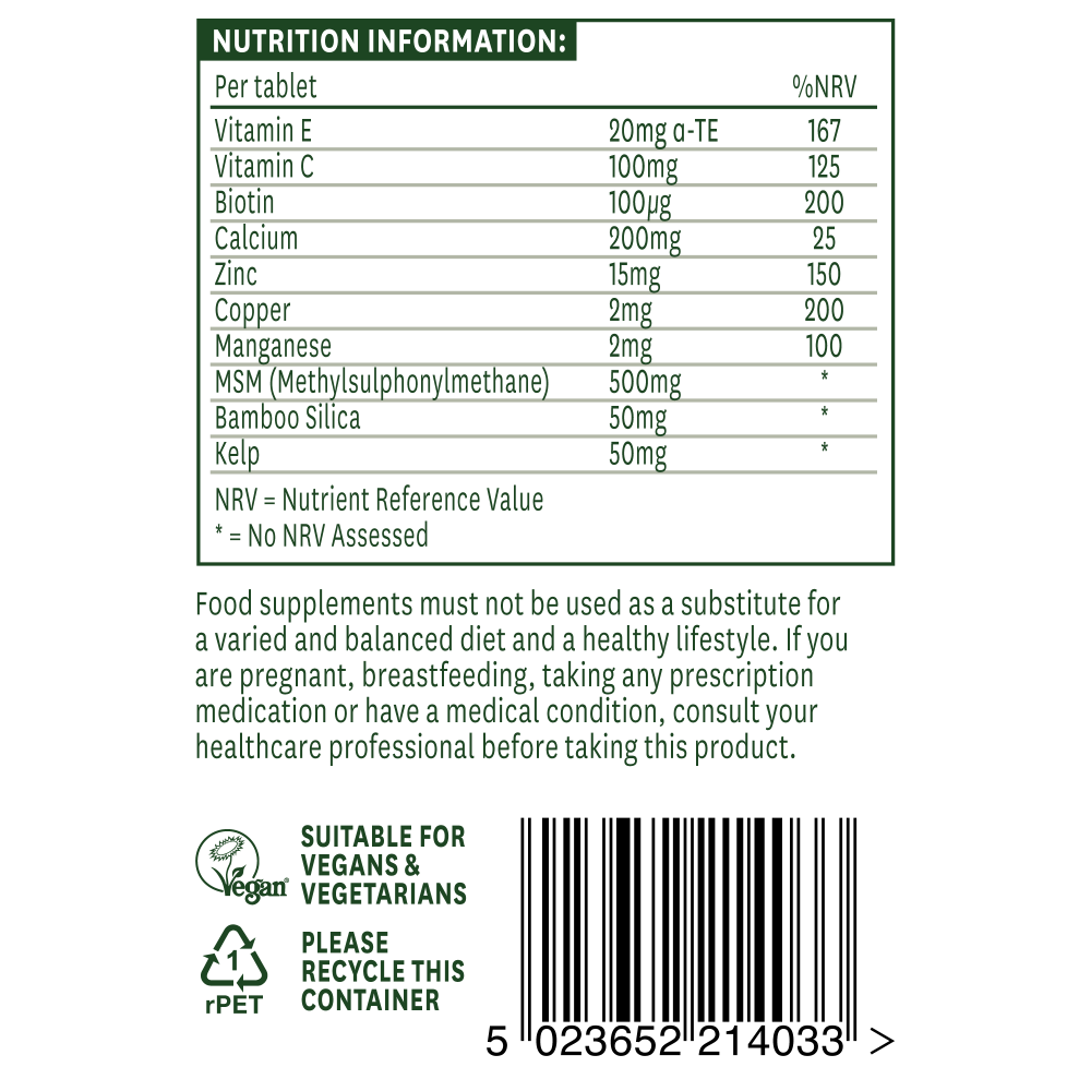 Ingredients: Calcium Carbonate Prep. (Calcium Carbonate, Maltodextrin), Methylsulphonylmethane, Vitamin C Prep. (Ascorbic Acid, Hydroxypropylmethylcellulose), Microcrystalline Cellulose, Kelp, Bamboo Silica, Anti-Caking Agent (Silicon Dioxide), Zinc Citrate, Natural Source Vitamin E (D-alpha Tocopheryl Acid Succinate - product of soya), Manganese Gluconate, Anti-Caking Agent (Vegetable Source Magnesium Stearate), Copper Gluconate, Biotin.