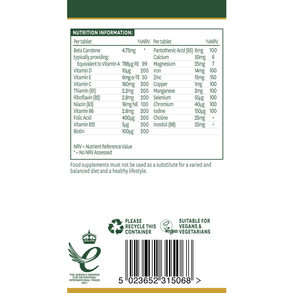 Ingredients: Microcrystalline Cellulose, Calcium Citrate, Di-Calcium Phosphate, Ascorbic Acid Prep. (Ascorbic Acid, Hydroxypropylmethylcellulose), Magnesium Citrate, Zinc Picolinate, Iron Bisglycinate, Choline Bitartrate, Crosscarmellose Sodium, Beta Carotene Prep. (Corn Starch, DL-alpha tocopherol, Sodium Ascorbate, Glucose, Starch), Inositol, Tablet Coating (Sodium Carboxymethyl Cellulose, Dextrin, Dextrose Monohydrate, Lecithin (Soya), Sodium Citrate), Manganese Gluconate, Nicotinamide, Anti-Caking Agent (Magnesium Stearate, Colloidal Silicon Dioxide), L-Selenomethionine Prep. (Dicalcium Phosphate, L-Selenomethionine), Vitamin E Succinate, Copper Gluconate, Calcium Pantothenate, Vitamin D3 Prep. (Corn Syrup, Gum Arabic, Mono & Diglycerides of Fatty Acids, Silicon Dioxide, D-Alpha tocopherol, Sodium Ascorbate), Pyridoxine HCl, Riboflavin, Thiamin HCl, Vitamin B12 Prep. (Calcium Phosphate, Cyanocobalamin), Folic Acid, Chromium Picolinate, Potassium Iodide, D-Biotin.