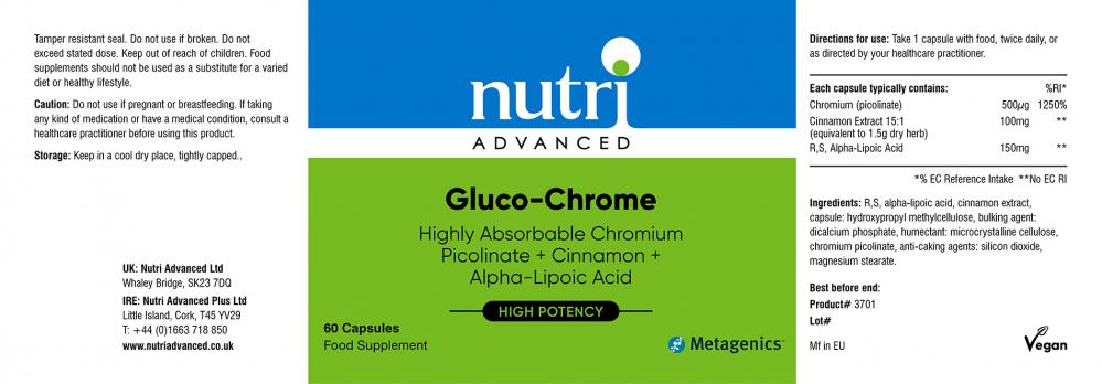 Ingredients: R,S, alpha-lipoic acid, chromium picolinate, cinnamon extract, capsule: hydroxypropyl methylcellulose, bulking agent: dicalcium phosphate, humectant: microcrystalline cellulose, anti-caking agents: silicon dioxide, magnesium stearate