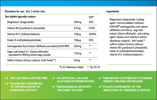 Ingredients: Magnesium bisglycinate, bulking agent: microcrystalline cellulose, KSM-66® ashwagandha root extract (Withania somnifera), sage leaf extract (Salvia officinalis), anti-caking agent: stearic acid, bamboo extract (Bambusa vulgaris), Safr'Inside™ saffron extract (Crocus sativus), vitamin B6 (pyridoxal-5-phosphate), folate (5-methyltetrahydrofolate), vitamin B12 (methylcobalamin)