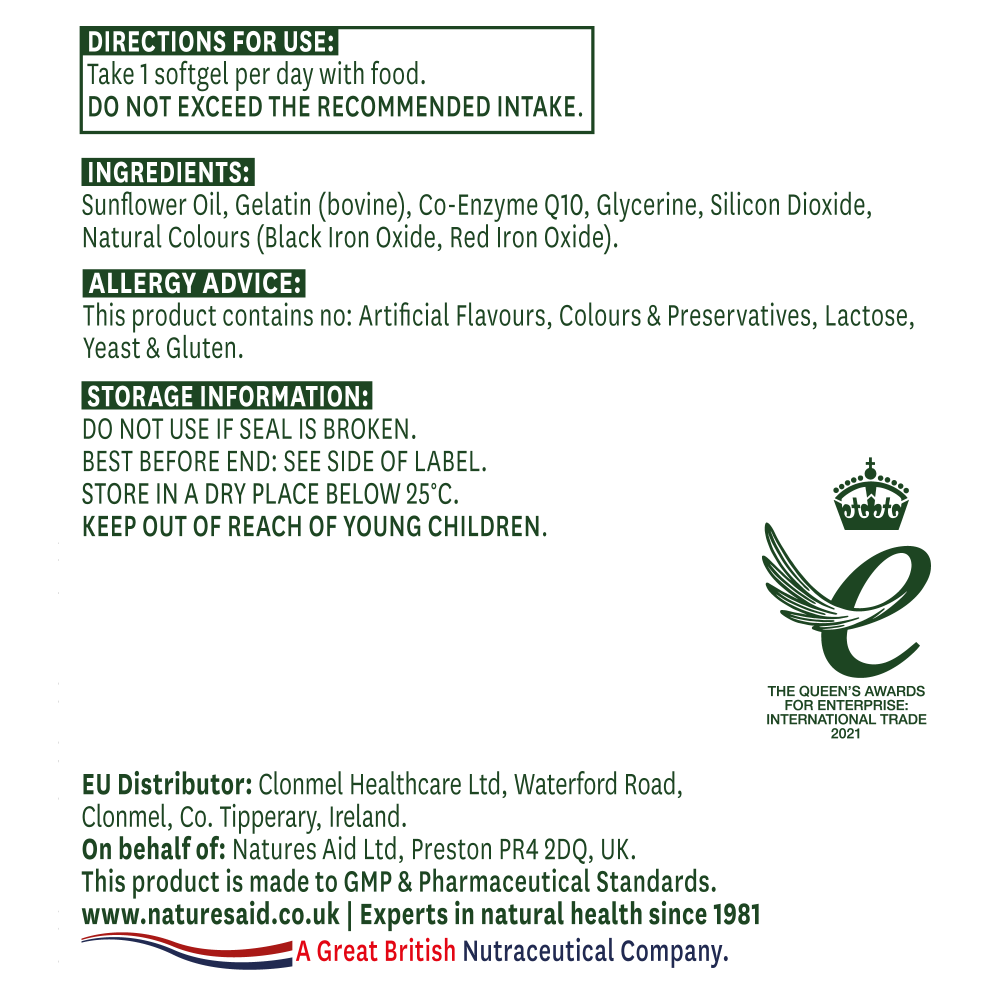 Ingredients: Sunflower Oil, Gelatin (Bovine), Co-Enzyme Q10, Glycerine, Silicon Dioxide, Natural Colours (Black Iron Oxide, Red Iron Oxide)