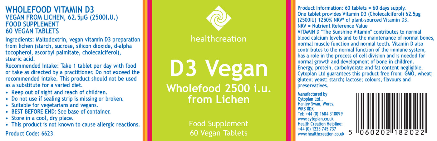 Cytoplan Health Creation D3 Vegan Wholefood 2500 iu from Lichen 60's