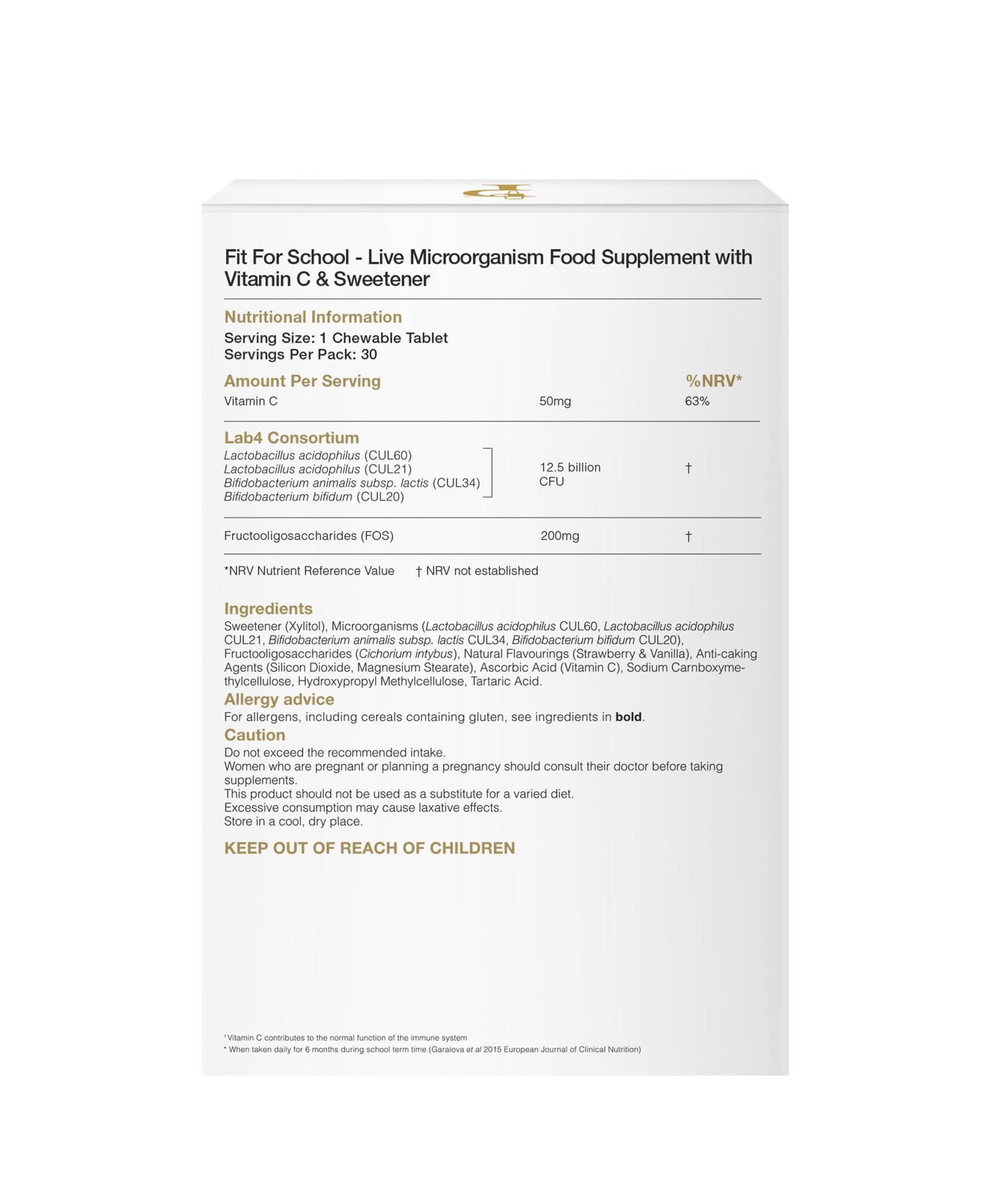 Ingredients: Sweetener (Xylitol), Microorganisms (Lactobacillus acidophilus CUL60, Lactobacillus acidophilus CUL21, Bifidobacterium animalis subsp. lactis CUL34, Bifidobacterium bifidum CUL20), Fructooligosaccharides (Cichorium intybus), Natural Flavourings (Strawberry & Vanilla), Anti-caking Agents (Silicon Dioxide, Magnesium Stearate), Ascorbic Acid (Vitamin C), Sodium Carnboxymethylcellulose, Hydroxypropyl Methylcellulose, Tartaric Acid