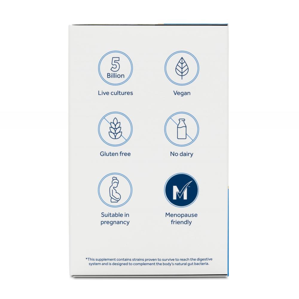 Ingredients: Potato starch; Live cultures: (Lactobacillus rhamnosus Rosell-11, Lactobacillus acidophilus/helveticus Rosell-52, Bifidobacterium longum Rosell-175, Bifidobacterium breve Rosell-70, Bifidobacterium bifidum Rosell-71, Lactococcus lactis Rosell-1058); Fructooligosaccharides (FOS 88mg); vegetarian capsule: hydroxypropyl methylcellulose; anti-caking agent: vegetable magnesium stearate; antioxidant: ascorbic acid