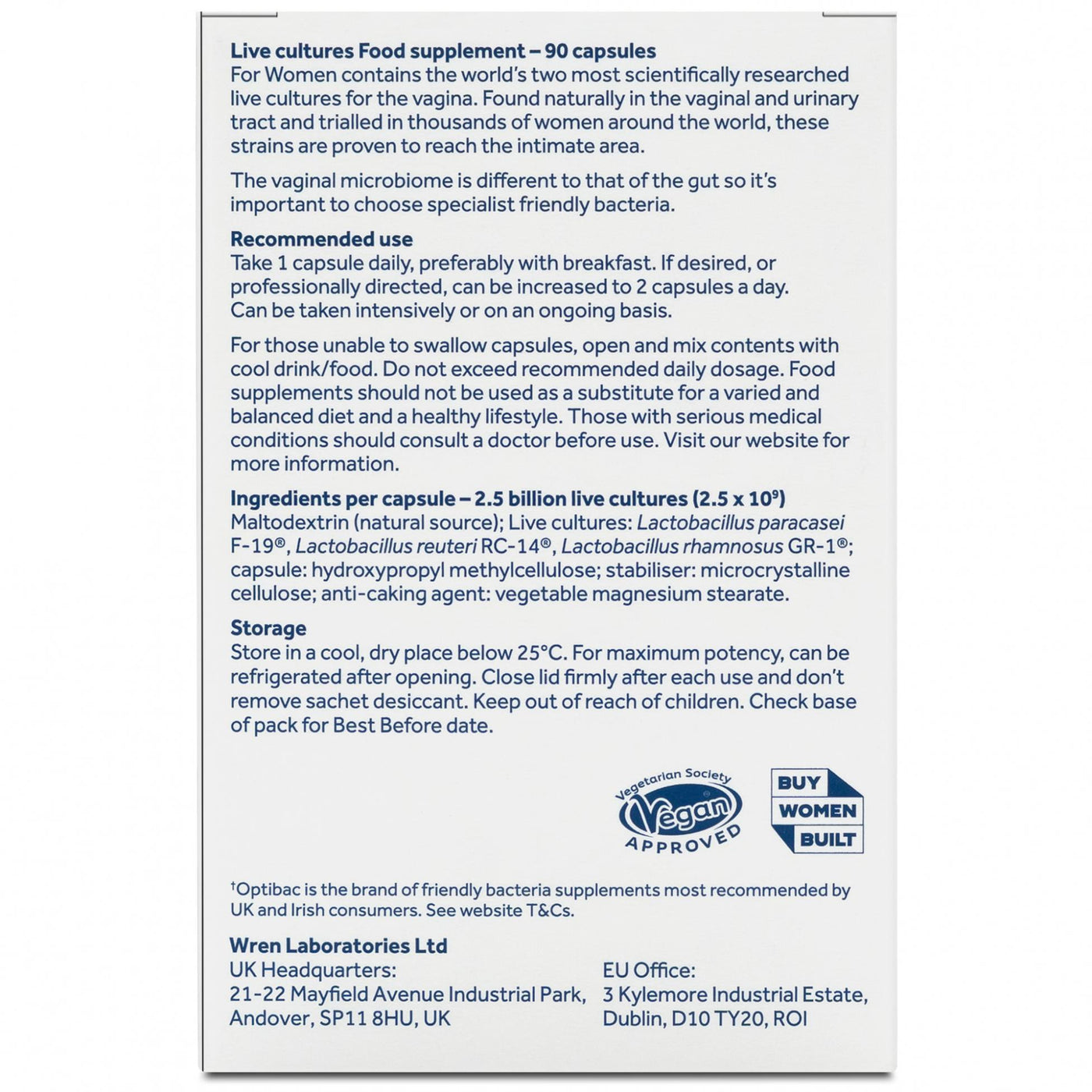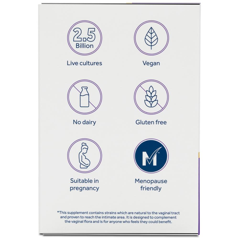 Ingredients: Maltodextrin (natural source); Live cultures: (Lactobacillus paracasei F-19®, Lactobacillus reuteri RC-14®, Lactobacillus rhamnosus GR-1®); vegetarian capsule: hydroxypropyl methylcellulose; stabiliser: microcrystalline cellulose; anti-caking agent: vegetable magnesium stearate