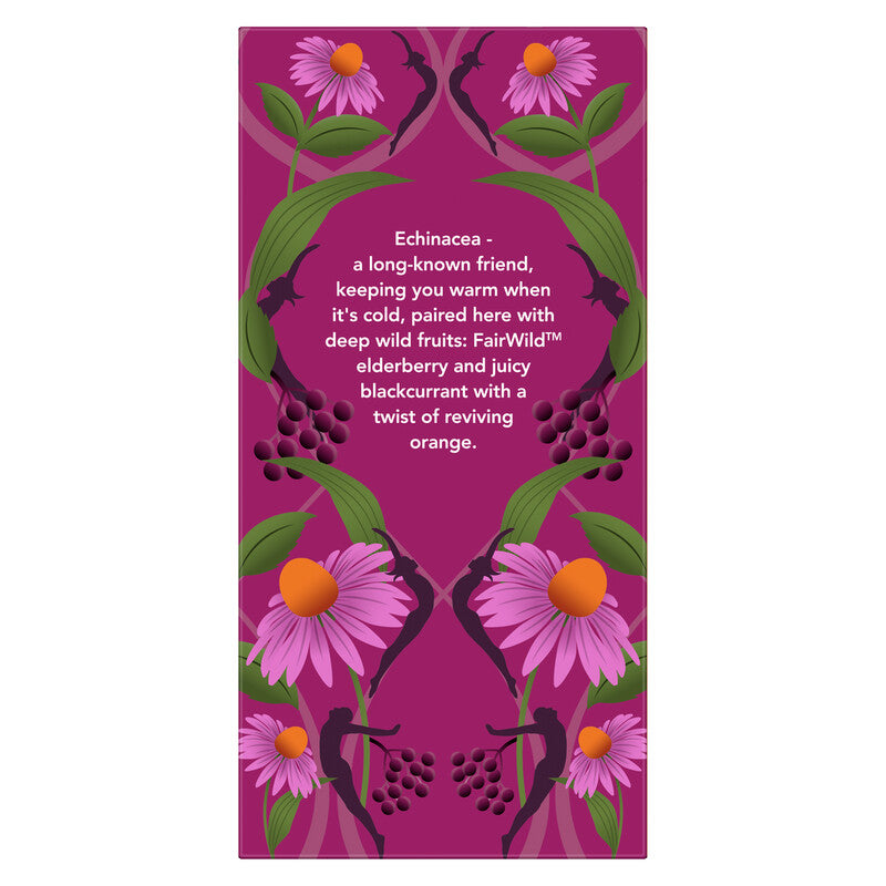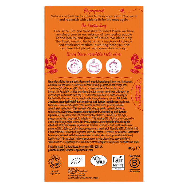 Ingredients: Naturally caffeine-free and ethically sourced ingredients: Ginger root, Licorice root, , echinacea root and leaf (11%), beetroot, aniseed, rosehip, peppermint leaf, orange peel, elderflower (5%), elderberry (4%), hibiscus, orange essential oil flavour, blackcurrant flavour