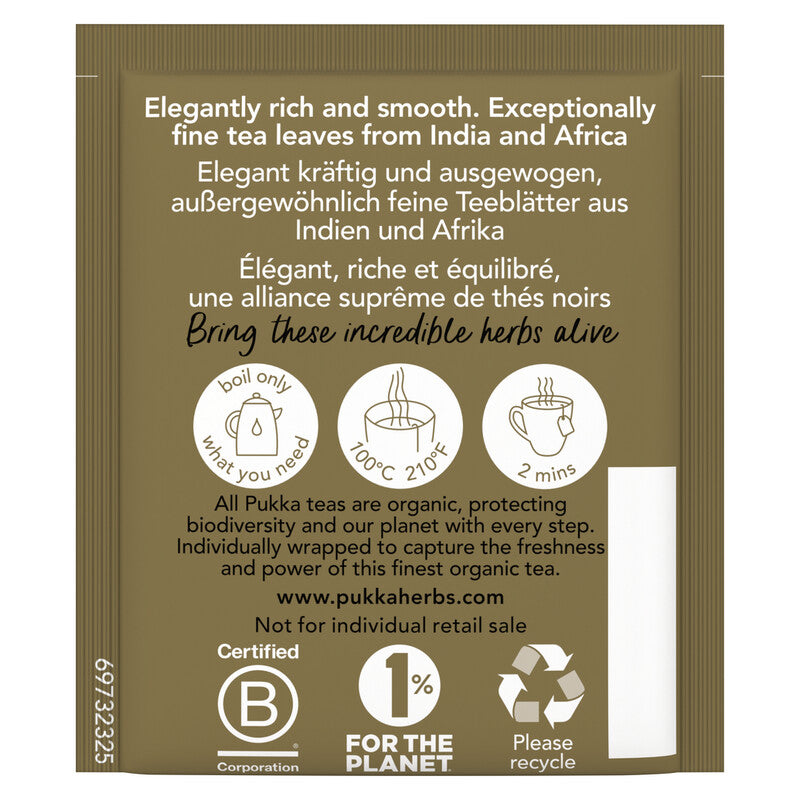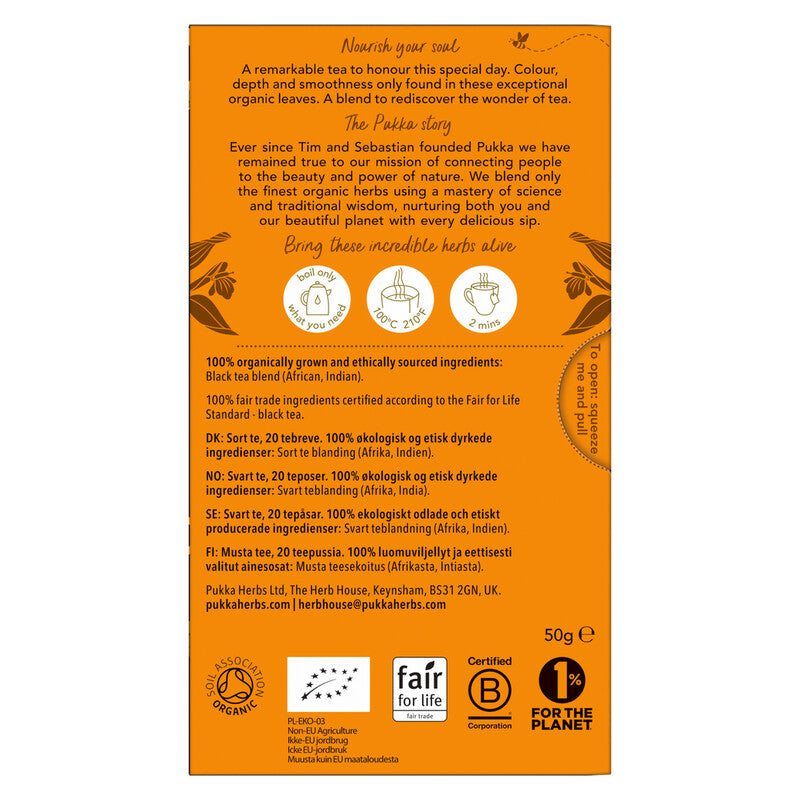 Ingredients: 100% organically grown and ethically sourced ingredients: Black tea blend (African, Indian)