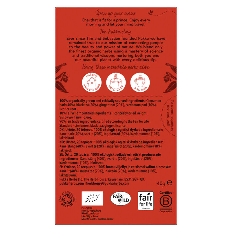 Ingredients: Cinnamon bark (40%), black tea (20%), ginger root (20%), cardamom pod (10%), licorice root.