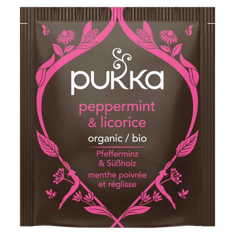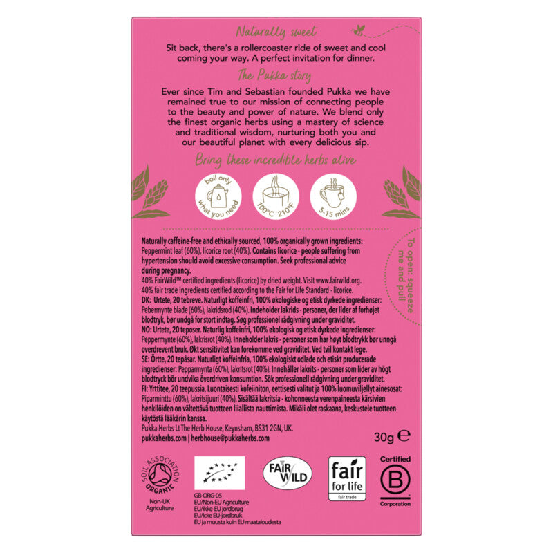 Ingredients: Naturally caffeine-free and ethically sourced. 100% organically grown ingredients: Peppermint leaf (60%), licorice root (40%).