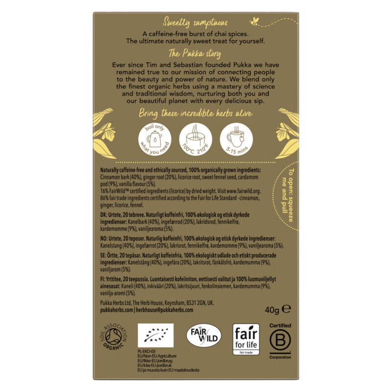 Ingredients: Cinnamon bark (40%), ginger root (20%), licorice root, sweet fennel seed, cardamom pod (9%), vanilla flavour (5%)