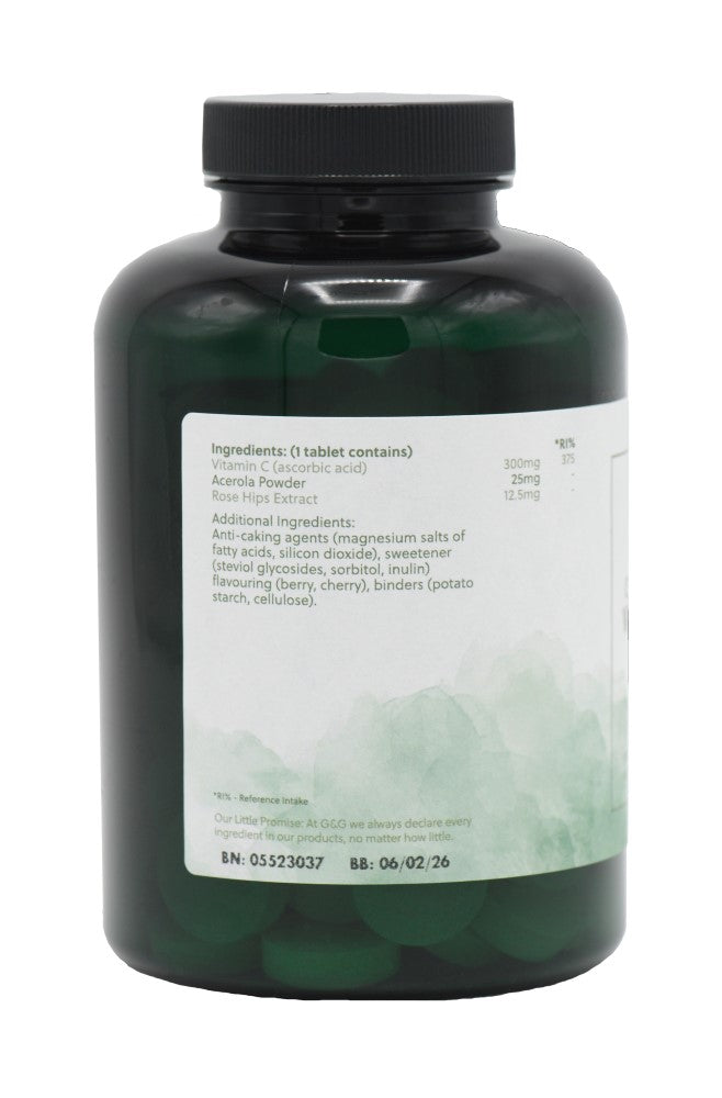 Ingredients: Vitamin C (ascorbic acid), Acerola powder, Rose hip extracts, Anti-caking agents (Magnesium salts of fatty acids, silicon dioxide), Sweetener (Steviol glycosides, Sorbitol, Inulin), Flavouring (berry, cherry), Binders (potato starch, cellulose)