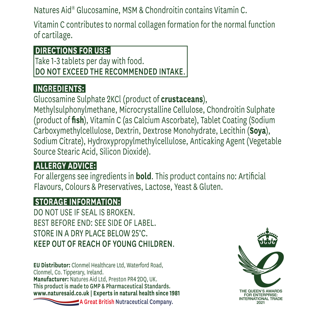 Ingredients: Glucosamine Sulphate 2KCl (product of crustaceans), Methylsulphonylmethane, Microcrystalline Cellulose, Chondroitin Sulphate (product of fish), Vitamin C (as Calcium Ascorbate), Tablet Coating (Sodium Carboxymethylcellulose, Dextrin, Dextrose Monohydrate, Lecithin (Soya), Sodium Citrate), Hydroxypropylmethylcellulose, Anti-Caking Agent (Vegetable Source Stearic Acid, Silicon Dioxide).