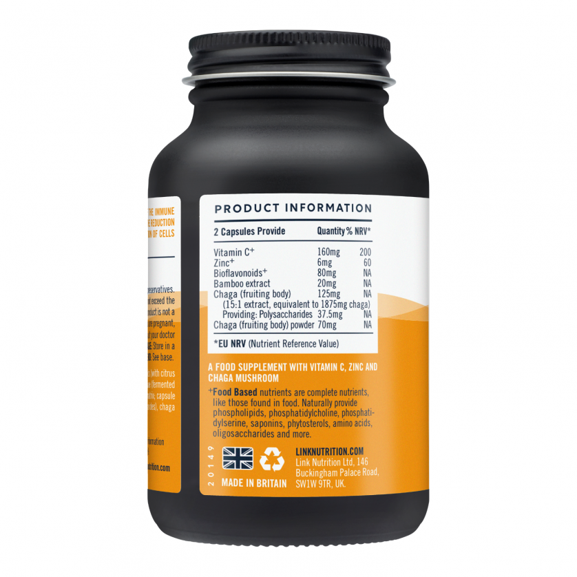 Ingredients: Bio-enhanced l-ascorbic acid and citrus bioflavonoids (with citrus fruit), zinc sulphate with enzyme digested saccharomyces cerevisiae (fermented non hexane washed soya) to become an integral part of a food matrix; capsule (vegetable cellulose), chaga mushroom extract (30% polysaccharides), chaga powder, bamboo extract.