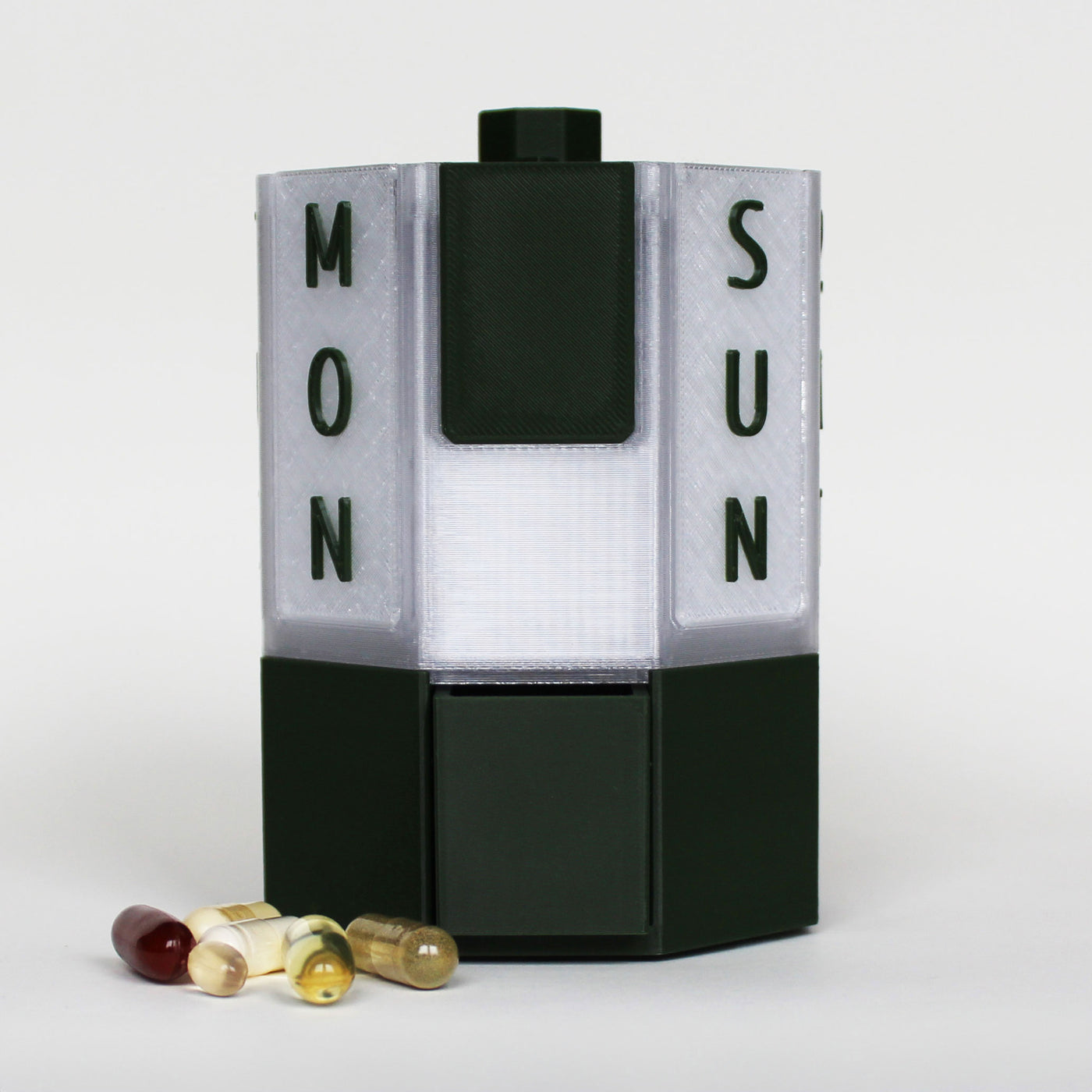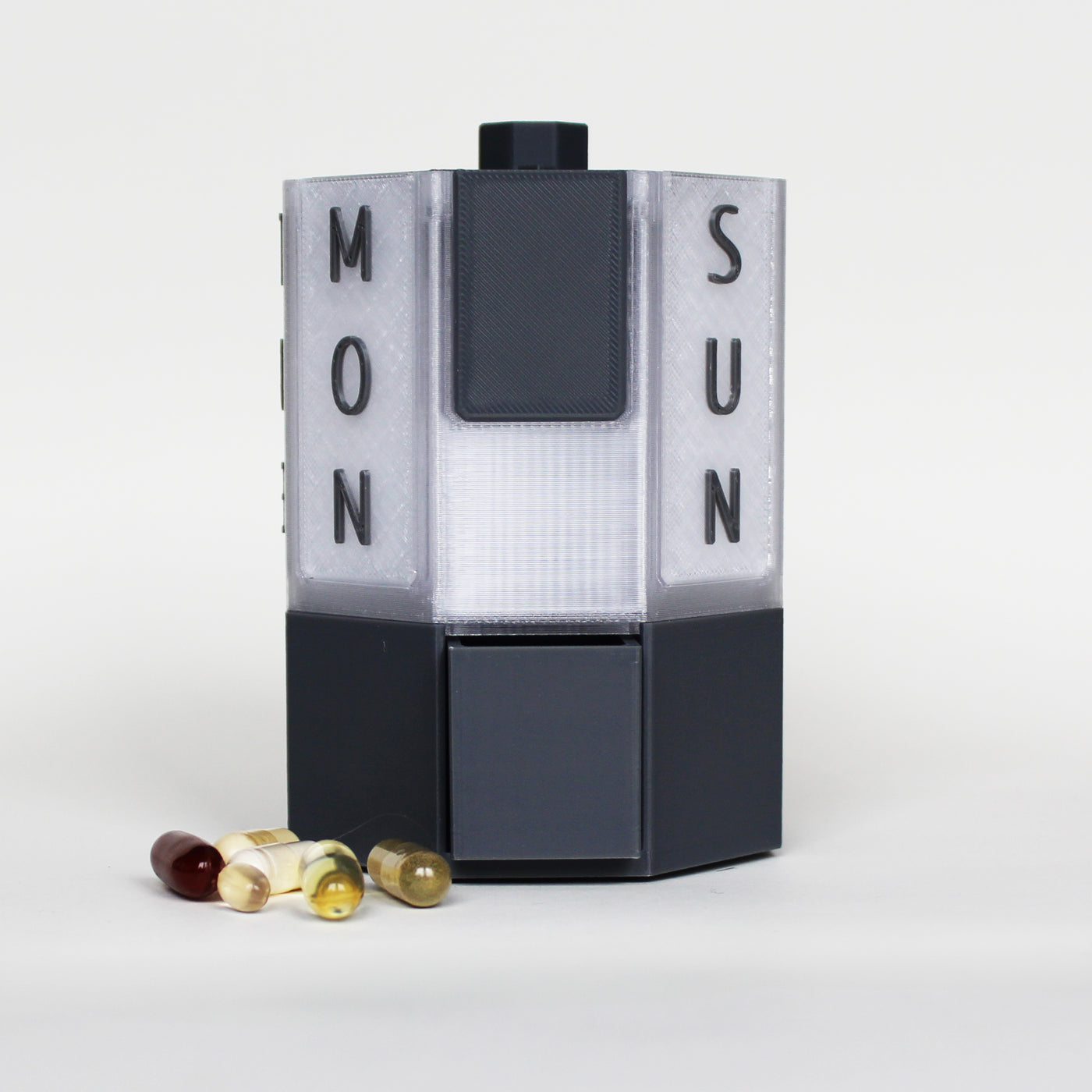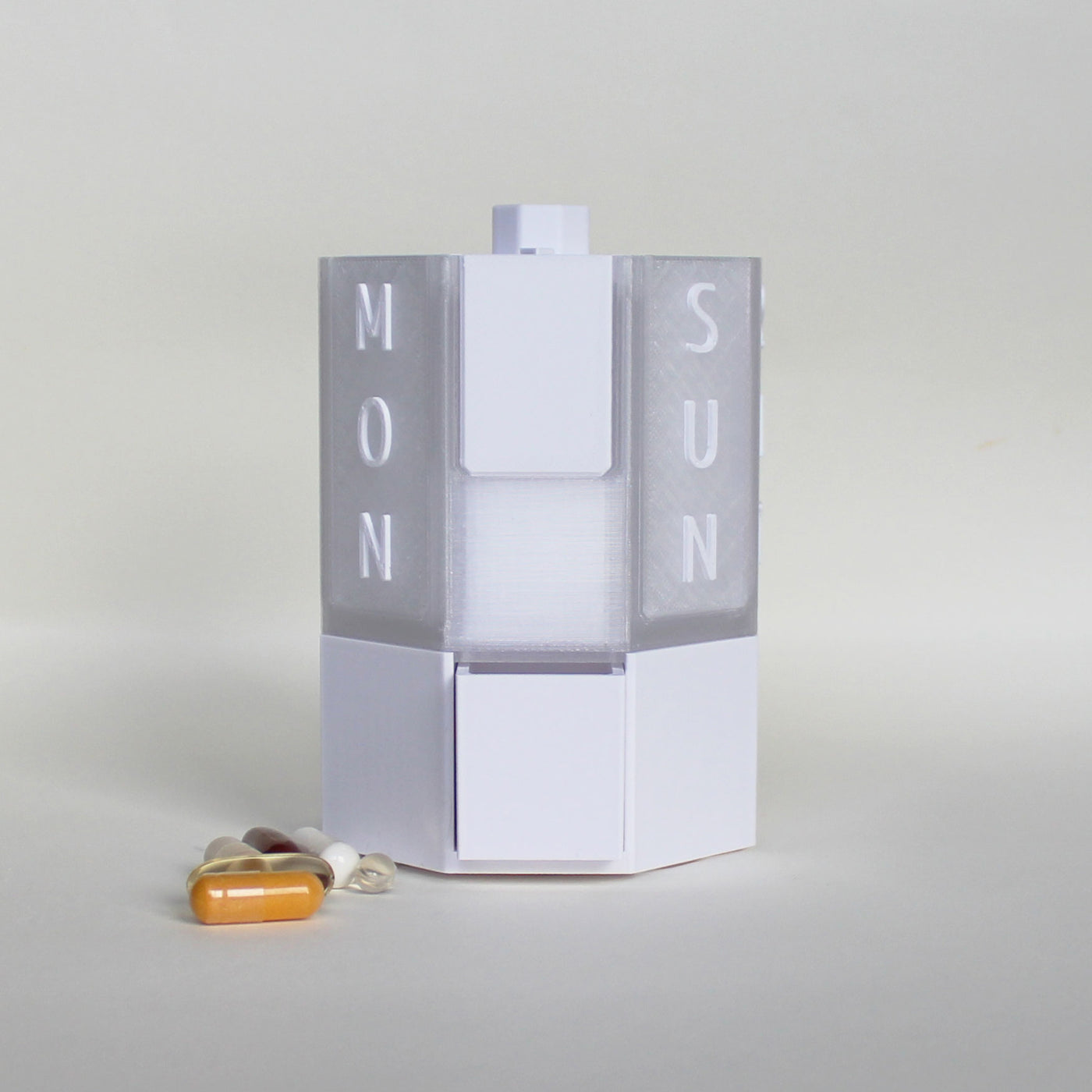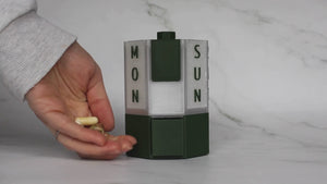 Weekly rotating pill dispenser for supplements and medication. Detachable, easy-to-clean design with matching travel box and lid included.