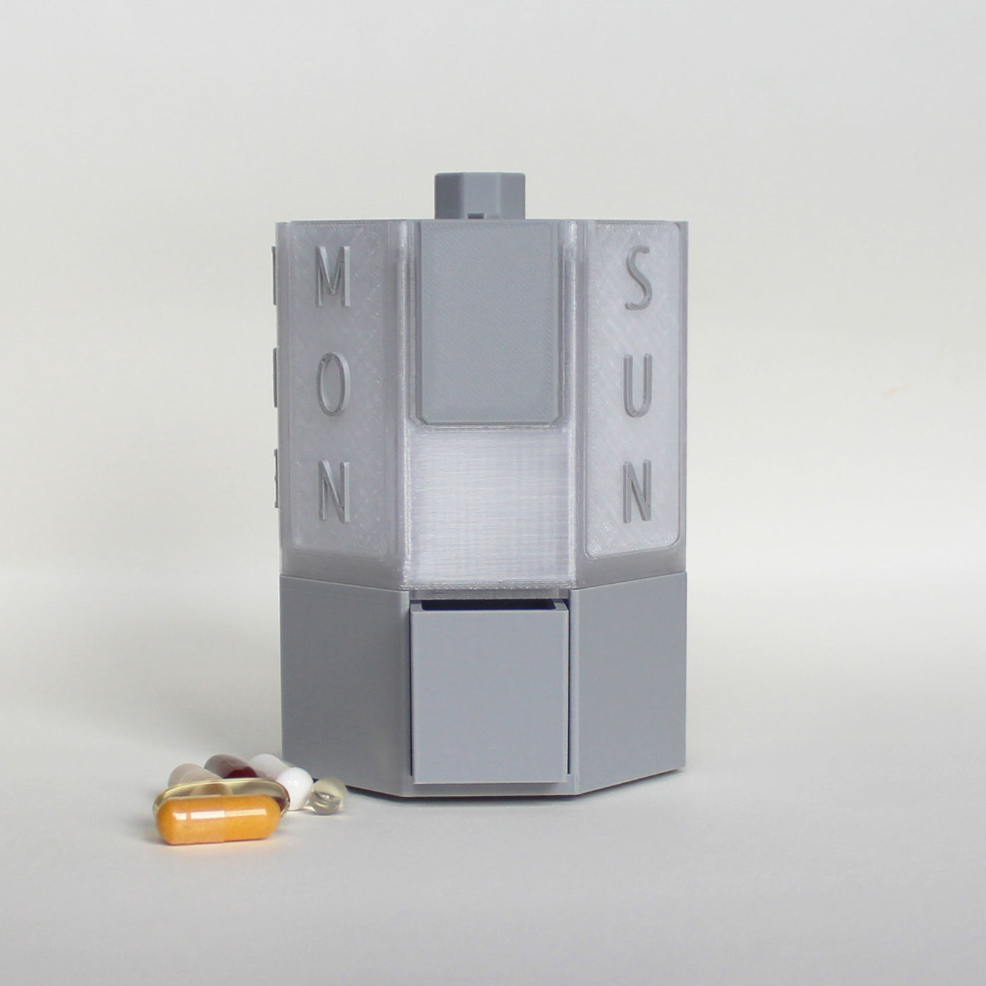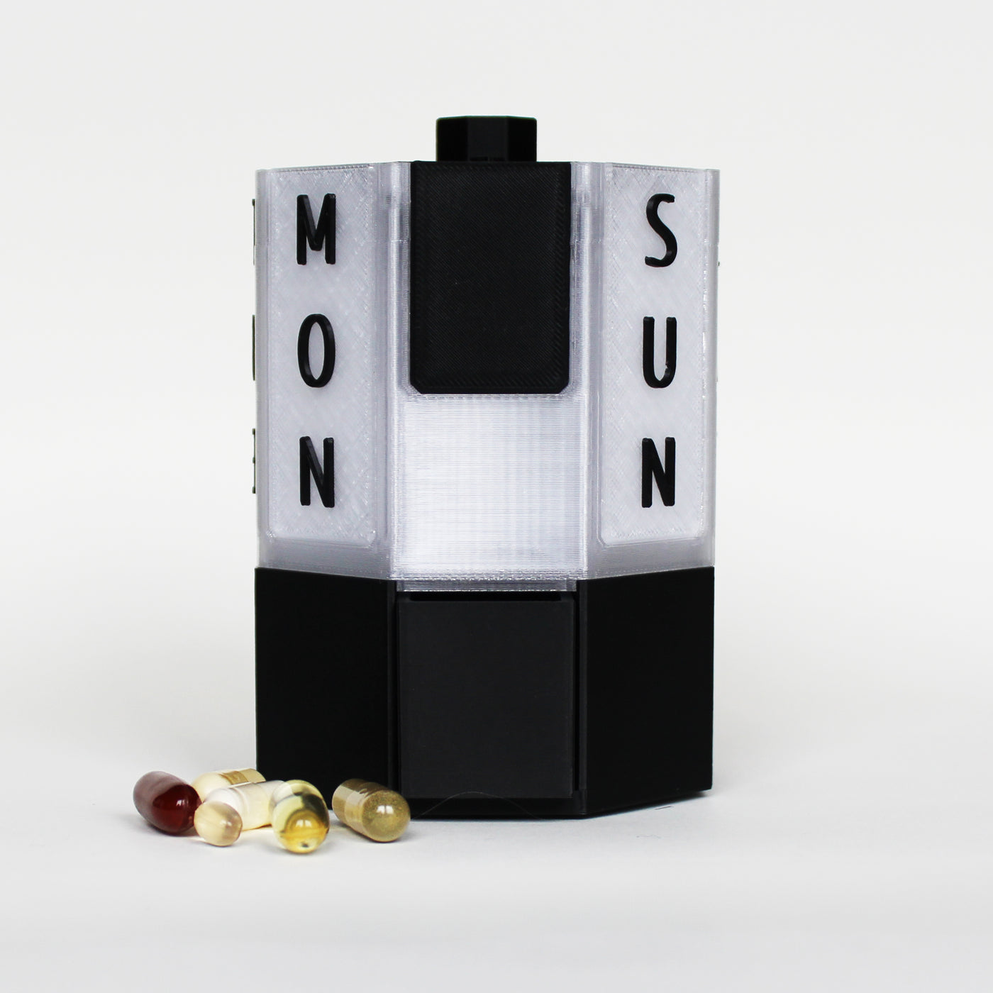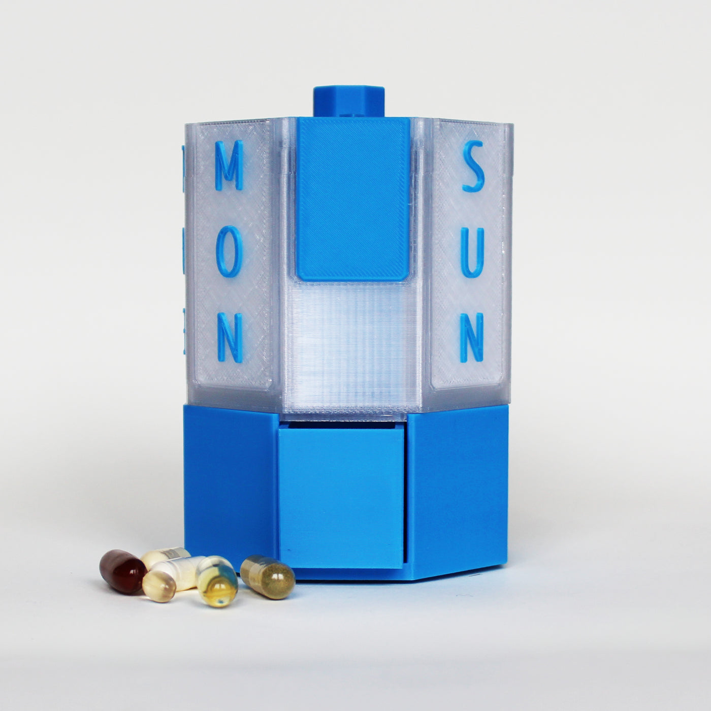 Weekly rotating pill dispenser for supplements and medication. Detachable, easy-to-clean design with matching travel box and lid included.