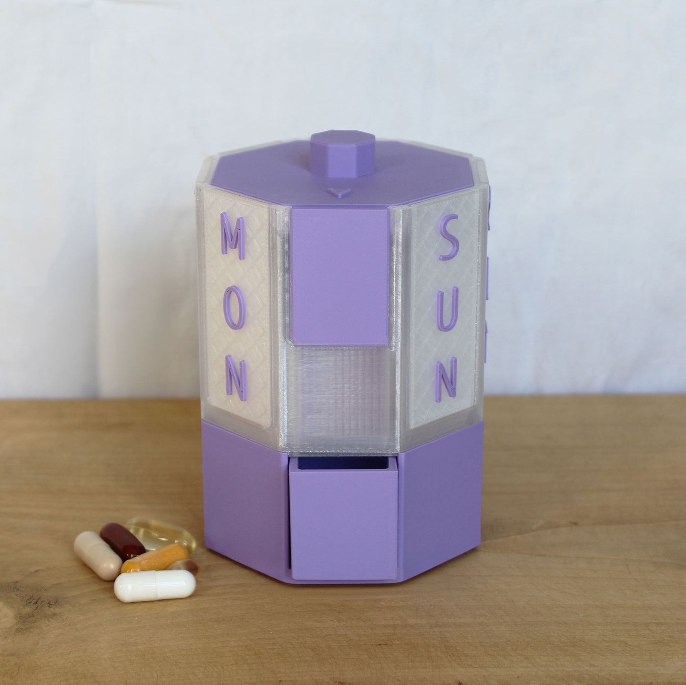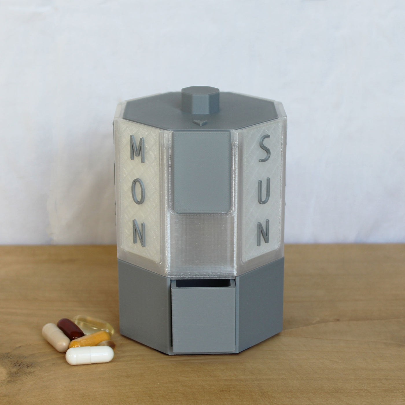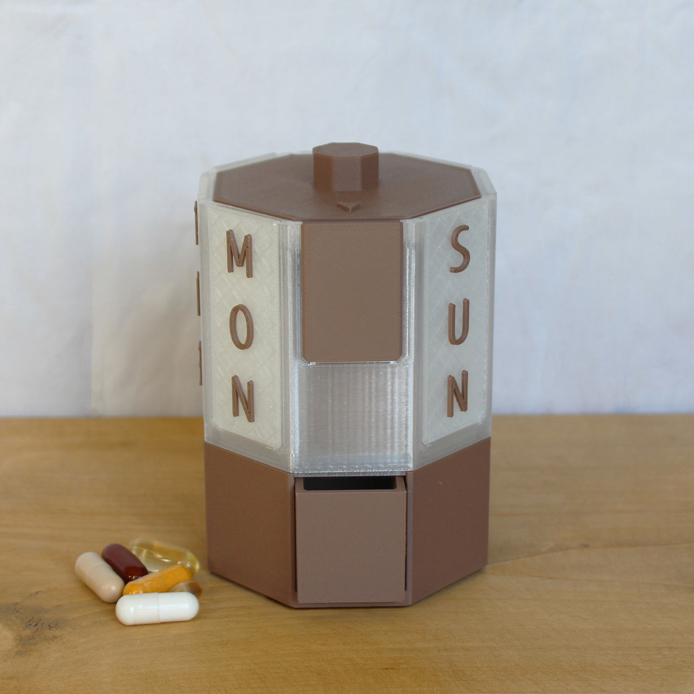 Weekly rotating pill dispenser for supplements and medication. Detachable, easy-to-clean design with matching travel box and lid included.