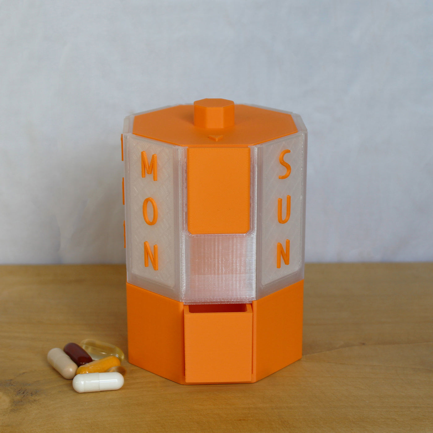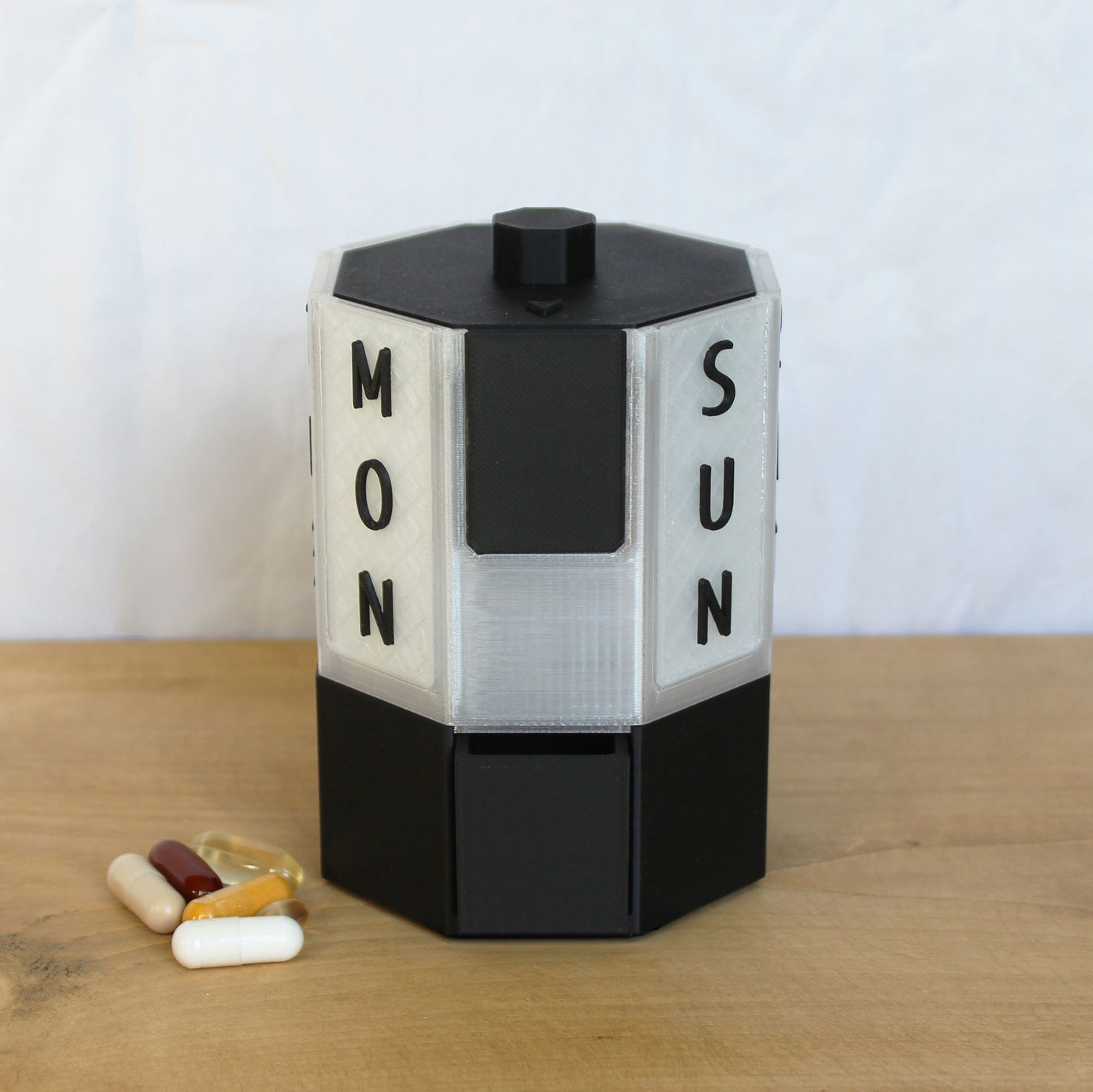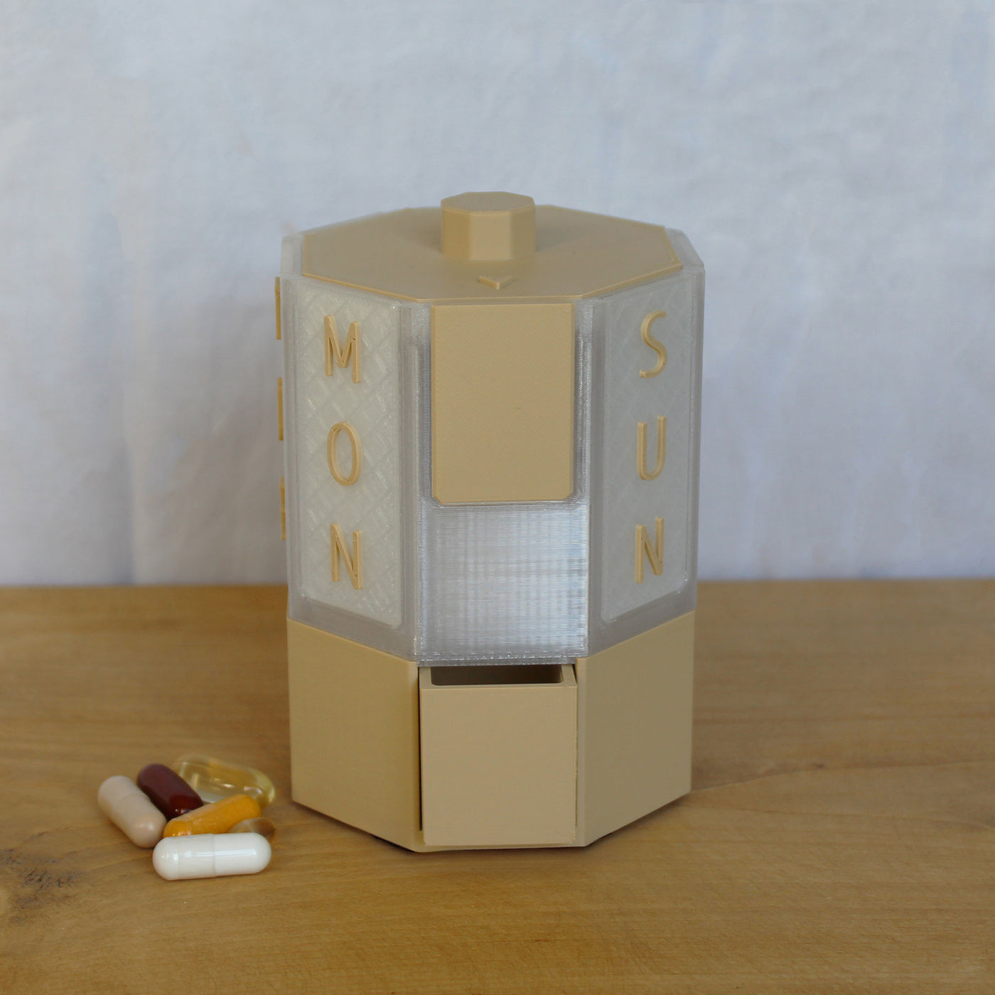 Weekly rotating pill dispenser for supplements and medication. Detachable, easy-to-clean design with matching travel box and lid included.