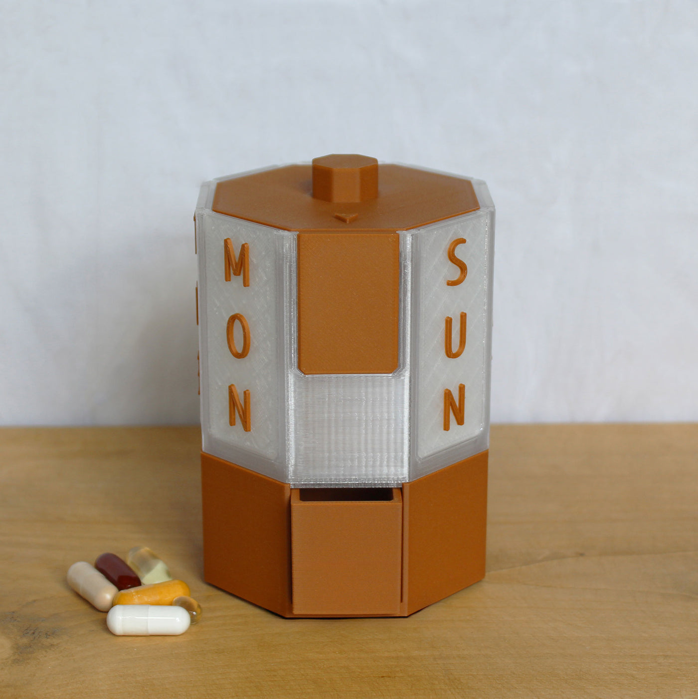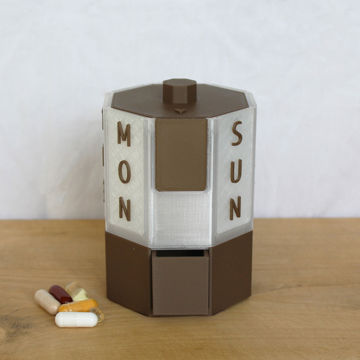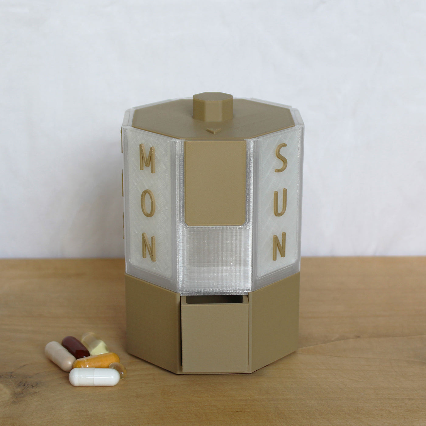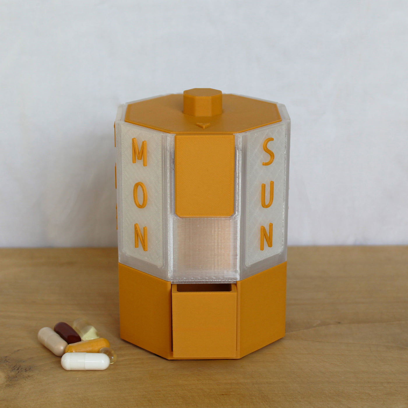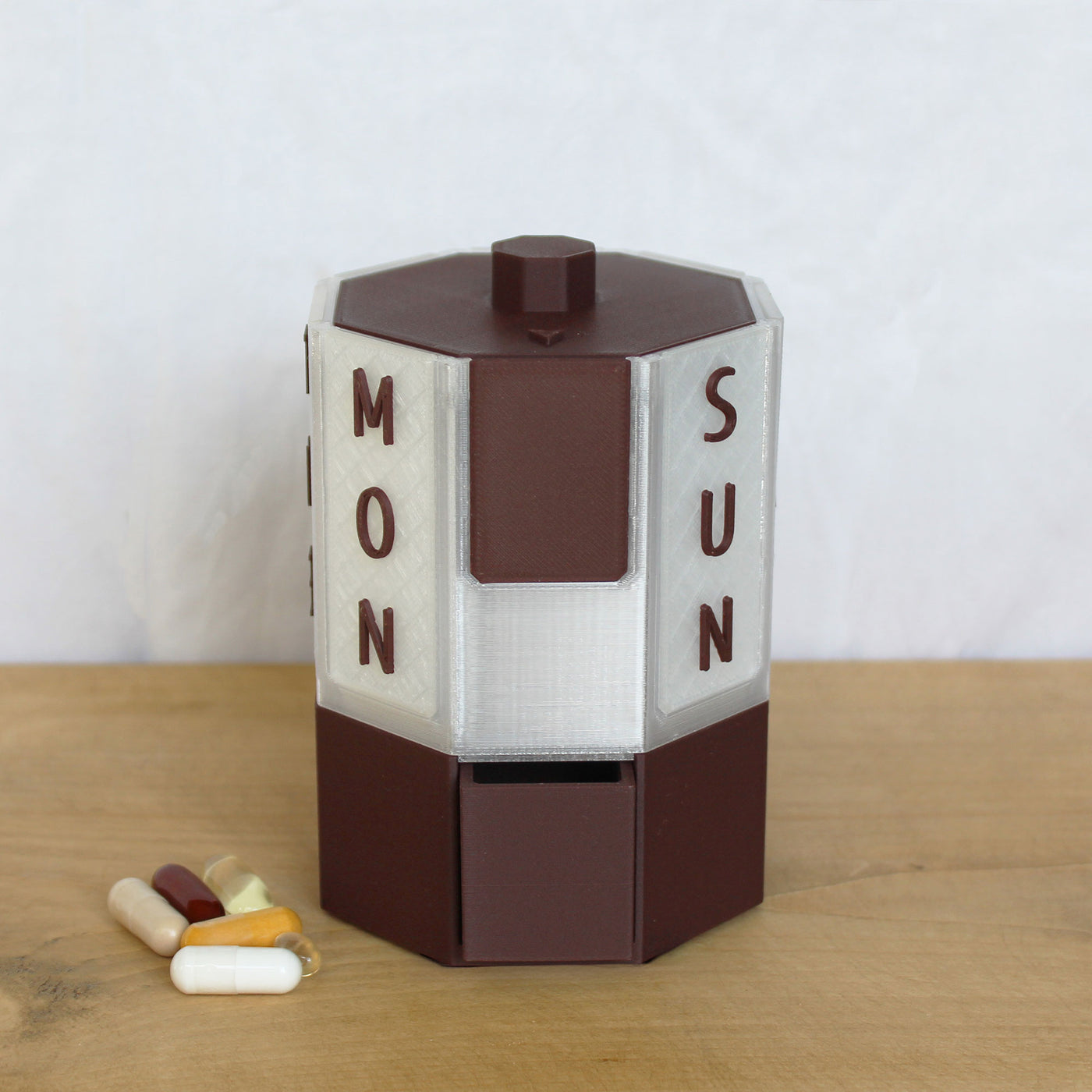 Weekly rotating pill dispenser for supplements and medication. Detachable, easy-to-clean design with matching travel box and lid included.
