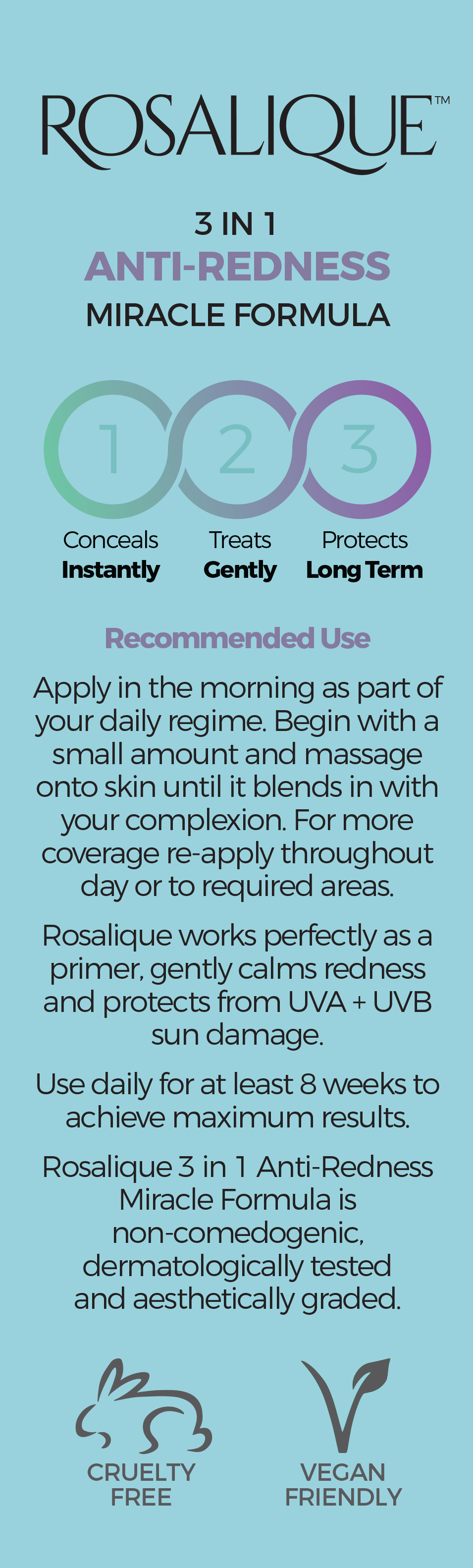 Directions: Apply in the morning as part of your daily regime. Begin with a small amount and massage onto skin until it blends in with your complexion. For more coverage re-apply throughout the day or to required areas. Rosalique works perfectly as a primer, gently calms redness and protects from UVA & UVB sun damage Use daily for at least 8 weeks to achieve maximum results Rosalique 3 in 1 Anti-Redness Miracle Formula is non-comedogenic, dermatologically tested and aesthetically graded