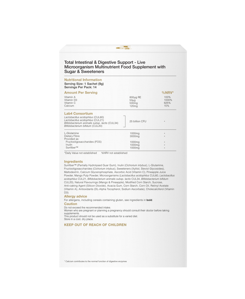 Ingredients: Sunfiber™ (Partially Hydrolysed Guar Gum), Inulin (Cichorium intybus), L-Glutamine, Fructooligosaccharides (FOS), Sweeteners (Xylitol, Steviol Glycosides), Maltodextrin, Calcium Glycerosphosphate, Vitamin C (Ascorbic Acid), Pineapple Juice Powder, Mango Pulp Powder, Microorganisms (Lactobacillus acidophilus CUL60 & CUL21, Bifidobacterium animalis subsp. lactis CUL 34, Bifidobacterium bifidum CUL 20), Natural Flavourings (Pineapple, Mango), Modified Corn Starch, Sucrose, Anti-caking Agent (Silicon Dioxide), Acacia Gum, Corn Starch, Corn Oil, Vitamin A (Retinyl Acetate), Antioxidants (DL-Alpha Tocopherol, Sodium Ascorbate), Vitamin D3 (Cholecalciferol)
