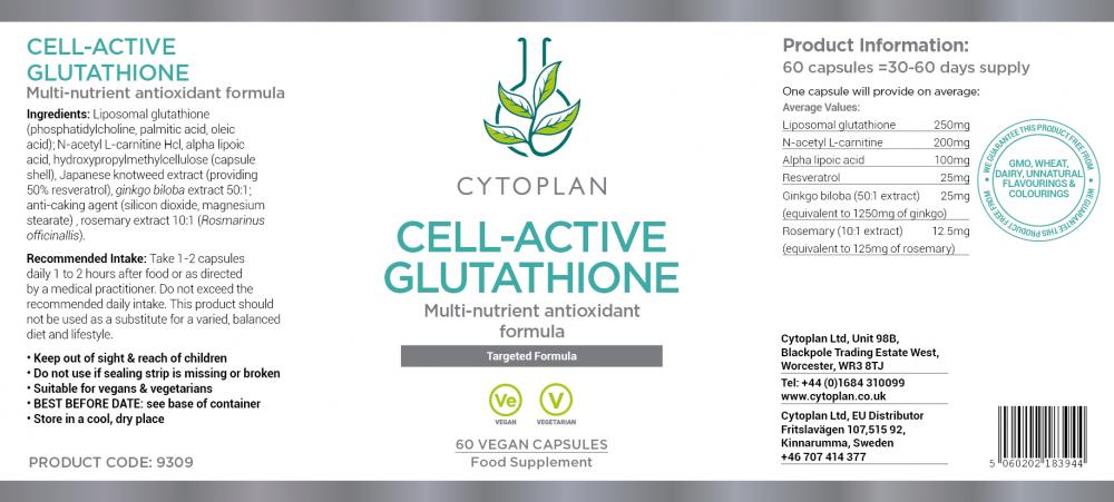 Ingredients: Liposomal glutathione (phosphatidyl choline, palmitic acid, oleic acid); N-acetyl l-carnitine; alpha lipoic acid; resveratrol (from Japanese knotweed extract); ginkgo biloba extract; rosemary leaf extract; silicon dioxide, magnesium stearate, hydroxypropyl methylcellulose (capsule shell).