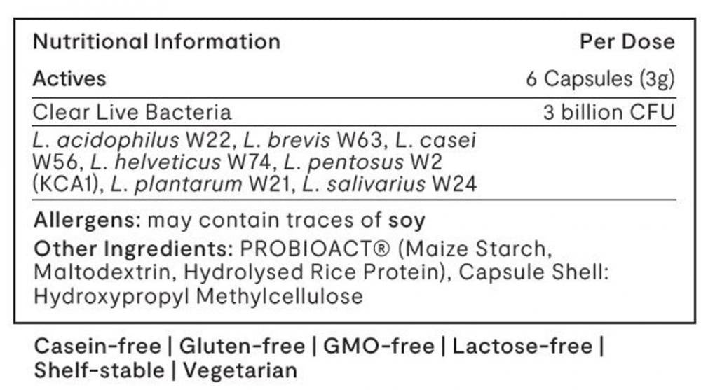 Ingredients: Clear Live Bacteria 3 billion CFU: Lactobacillus acidophilus, Lactobacillus brevis, Lactobacillus casei, Lactobacillus helveticus, Lactobacillus pentosus, Lactobacillus plantarum, Lactobacillus salivarius. Other ingredients: Maize starch, Maltodextrin, Hydrolysed rice protein, Capsule Shell: Hydroxypropylmethylcellulose.