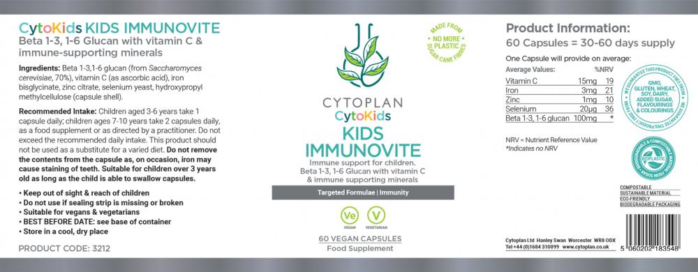 Ingredients: Beta 1-3,1-6 glucan (from Saccharomyces cerevisiae, 70%), vitamin C (as ascorbic acid), iron bisglycinate, zinc citrate, selenium yeast, hydroxypropyl methylcellulose (capsule shell)