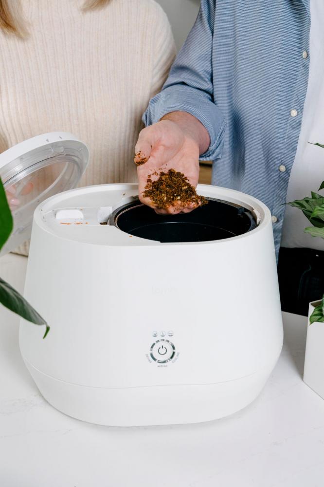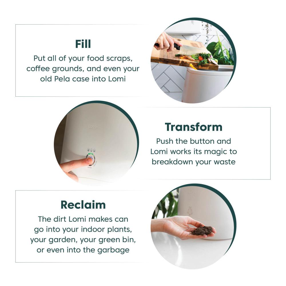 Directions: Put all of your food scraps, coffee grounds, etc into Lomi. Push the button and Lomi works its magic to breakdown your waste. The material Lomi makes can go into your indoor plants, your garden, or your green bin depending on the mode you select. With Lomi, you simply press a button. Lomi's internal sensors simulate and accelerate the composting process and produce nutrient-rich output in as little as 4 hours. Lomi uses 60kWh of energy per 100 cycles.