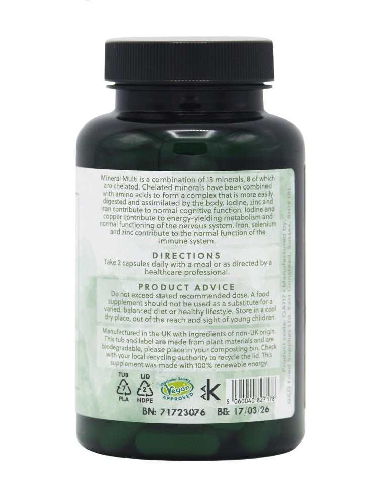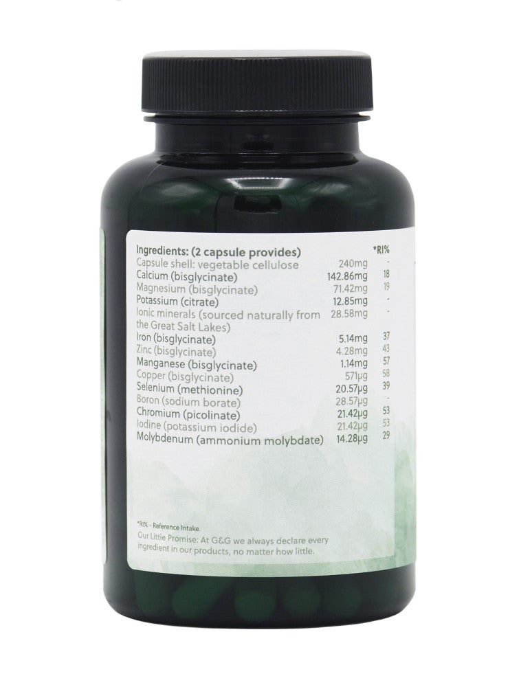 Ingredients: Calcium (bisglycinate), Magnesium (bisglycinate), Ionic minerals (sourced naturally from the Great Salt Lake), Potassium (citrate), Iron (bisglycinate), Zinc (bisglycinate), Manganese (bisglycinate), Copper (bisglycinate), Iodine (potassium iodide), Boron (sodium borate), Chromium (picolinate), Selenium (methionine), (dicalcium, phosphate, L-selenomethionine), Molybdenum (ammonium molybdate), vegetable cellulose capsule