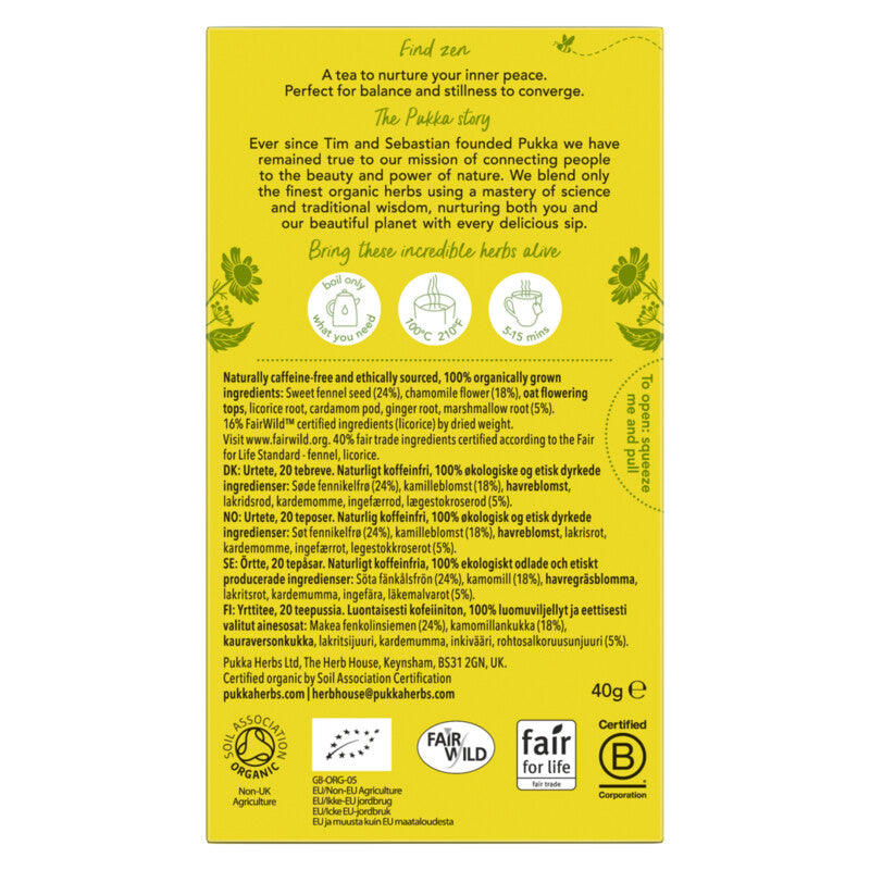 Ingredients: Sweet fennel seed (24%), Chamomile flower (18%), oat flowering tops, licorice root, cardamom pod, ginger root, marshmallow root (5%).