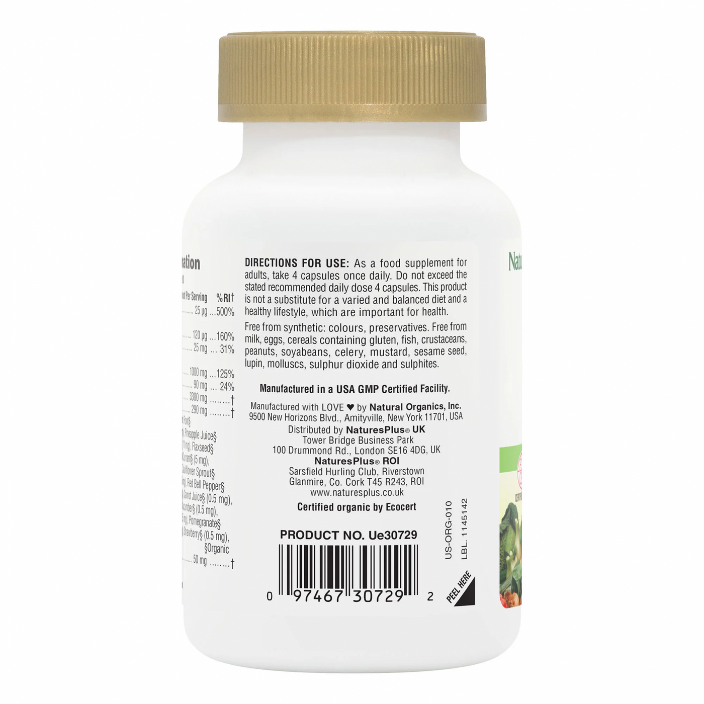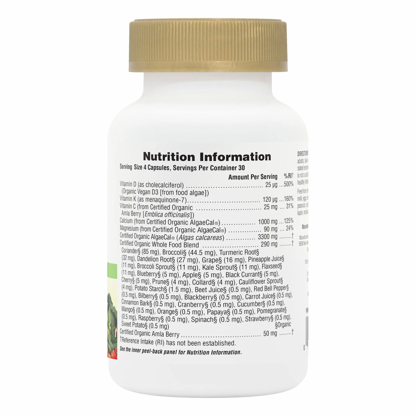 Ingredients: Certified Organic AlgaeCal®, Capsule* (Pullulan Polysaccharides [from Aureobasidium pullulans]), Coconut oil Powder*, Rice Bran Extract*, Coriander*, Amla Berry*, Broccoli*, Turmeric Root*, Dandelion Root*, Menaquinone-7, Grape*, Cholecalciferol, Pineapple Juice*, Broccoli Sprout*, Kale Sprout*, Flaxseed*, Blueberry*, Apple*, Blackcurrant*, Cherry*, Prune*, Collard*, Cauliflower Sprout*, Potato Starch*, Beet Juice*, Red Bell Pepper*, Bilberry*, Blackberry*, Carrot Juices, Cinnamon Bark*, Cranberry*, Cucumber*, Mango*, Orange*, Papaya*, Pomegranate*, Raspberry*, Spinach*, Strawberry*, Sweet Potato*